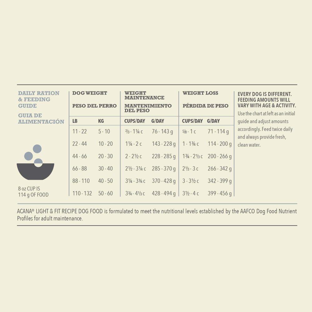 Bring home the quality nutrition your dog needs with ACANA Light & Fit Recipe Adult Dry Dog Food. This high protein dog food is a light and fit formula to support a healthy body weight and peak conditioning. Protein-rich Free-Run**** Chicken and Free-Run**** Turkey are balanced with fruits and vegetables, including pumpkin, collard greens, apples and pears, to offer complete nutrition. This ACANA dog food is 60 percent* quality animal ingredients and 40 percent** fruits and vegetables. Even better, this grain free*** dry dog food has a freeze dried coating made of chicken and turkey liver for a delicious taste your dog will love. *Approximate and derived from the unprocessed state of the ingredients **We also add vitamins, minerals, natural preservatives, flavors and probiotics ***Produced in a facility that also processes grains ****Our free-run chickens and turkeys are not housed in cages and are able to move in a barn without outdoor access.<h3>Why We Love It</h3><br><ul><li>One (1) 4.5 lb bag of ACANA Light & Fit Recipe Adult Dry Dog Food<li>High protein dry dog food kibble features 60 percent* high-quality animal ingredients and 40 percent** wholesome fruits and vegetables<li>A freeze dried coating adds a delicious flavor dogs love</ul>From limited ingredient diets to recipes for all life stages, ACANA® recipes for dogs and cats are thoughtfully crafted from start to finish to ensure that your pet has the high quality, balanced nutrition needed to live a long and happy life.