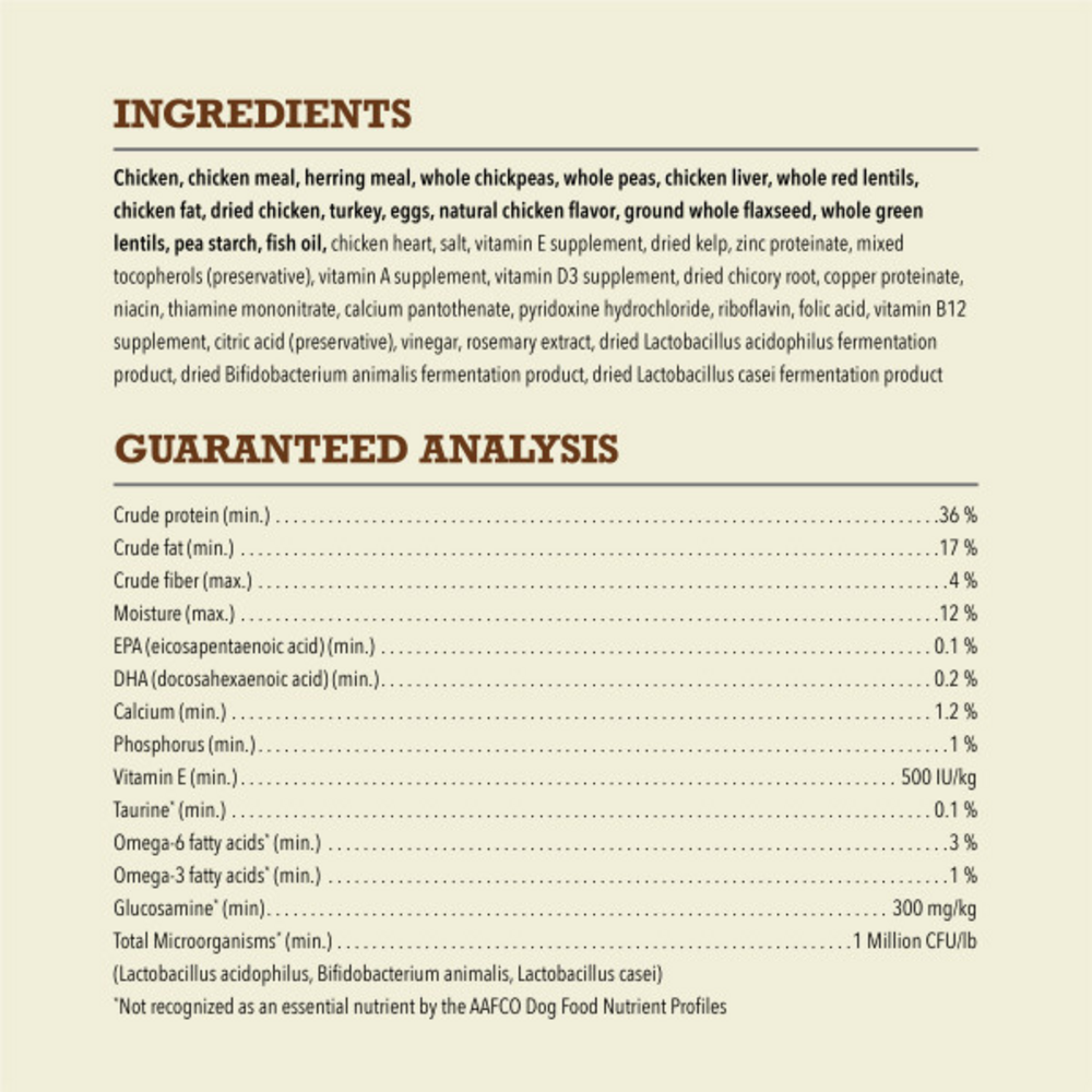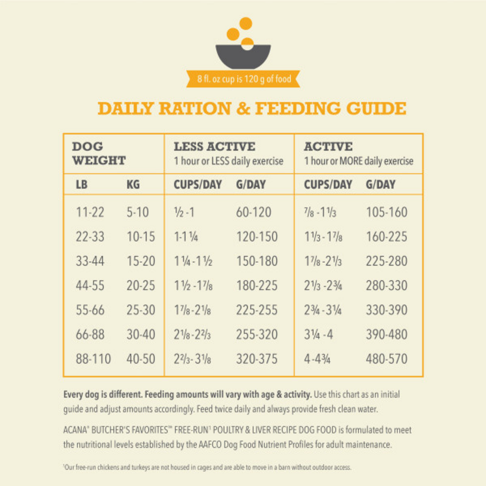 Bring home the quality nutrition your dog needs to thrive with ACANA Butcher's Favorites Free-Run Poultry* & Liver Recipe Dry Dog Food. This high protein dog food includes premium ACANA freeze dried dog food kibble and tender pieces of protein-rich real chicken jerky your dog will crave. Fresh or raw free run chicken*, chicken liver and turkey are balanced with chickpeas, peas, & lentils to help maintain a healthy weight. The dry dog food is 70 percent** animal ingredients and 30 percent*** plant ingredients and nutrients. Even better, nutritious ingredients in this ACANA dog food kibble help support three key health benefits, including digestive health, a healthy weight and a healthy skin and coat. Our included fresh ingredients use refrigeration as the sole method of preservation and our included raw ingredients are frozen at their peak freshness. Choose ACANA dry dog food to give your companion the nutritional foundation they need to live a happy, healthy life. *Our free-run chickens and turkeys are not housed in cages and are able to move in a barn without outdoor access**Approximate and derived from the unprocessed state of the ingredients ***We also add vitamins, minerals, natural preservatives flavors and probiotics
