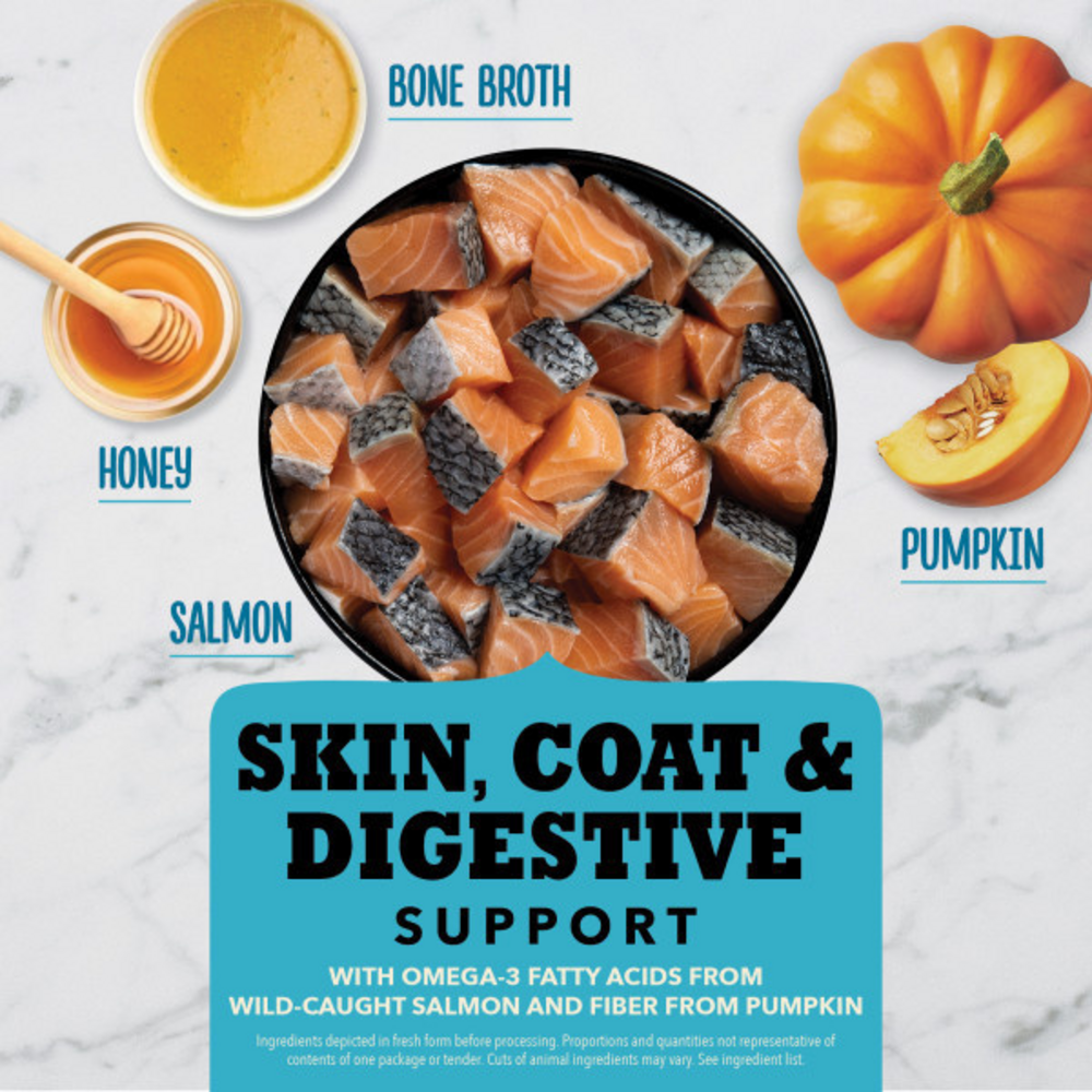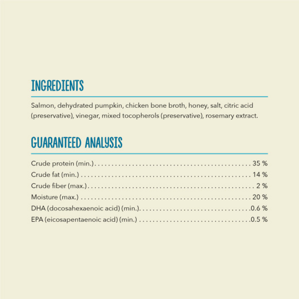 Bring home quality nutrition in a delicious treat for your dog with ACANA Chewy Tenders Salmon Dog Treats. Crafted with ingredients you can feel good about, this dog treat recipe features protein-rich, wild-caught salmon and bone broth plus fiber-rich pumpkin to help support gut health. Sweet honey adds a soft, chewy texture to these high protein dog treats to keep your dog satisfied, making them a perfect snack when you want to treat your dog to delicious flavor and happiness. These ACANA dog treats are made with 85 percent* animal ingredients to provide a burst of protein and tempting flavor. No artificial preservatives, flavors or colors added in our kitchen and no low-cost ingredients like soy, corn, tapioca or wheat to ensure your furry family member gets only the best. Even better, nutritious ingredients like Omega-3 fatty acids from salmon and fiber from pumpkin help support your dog's skin, coat and digestive health. Choose ACANA treats to give your companion the nutritional foundation they need to live a happy, healthy life. *Approximate and derived from the unprocessed state of the ingredients