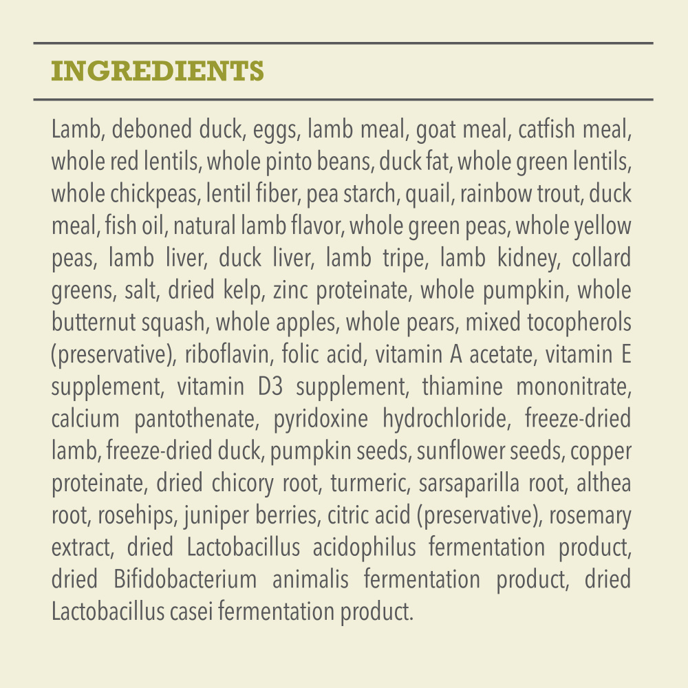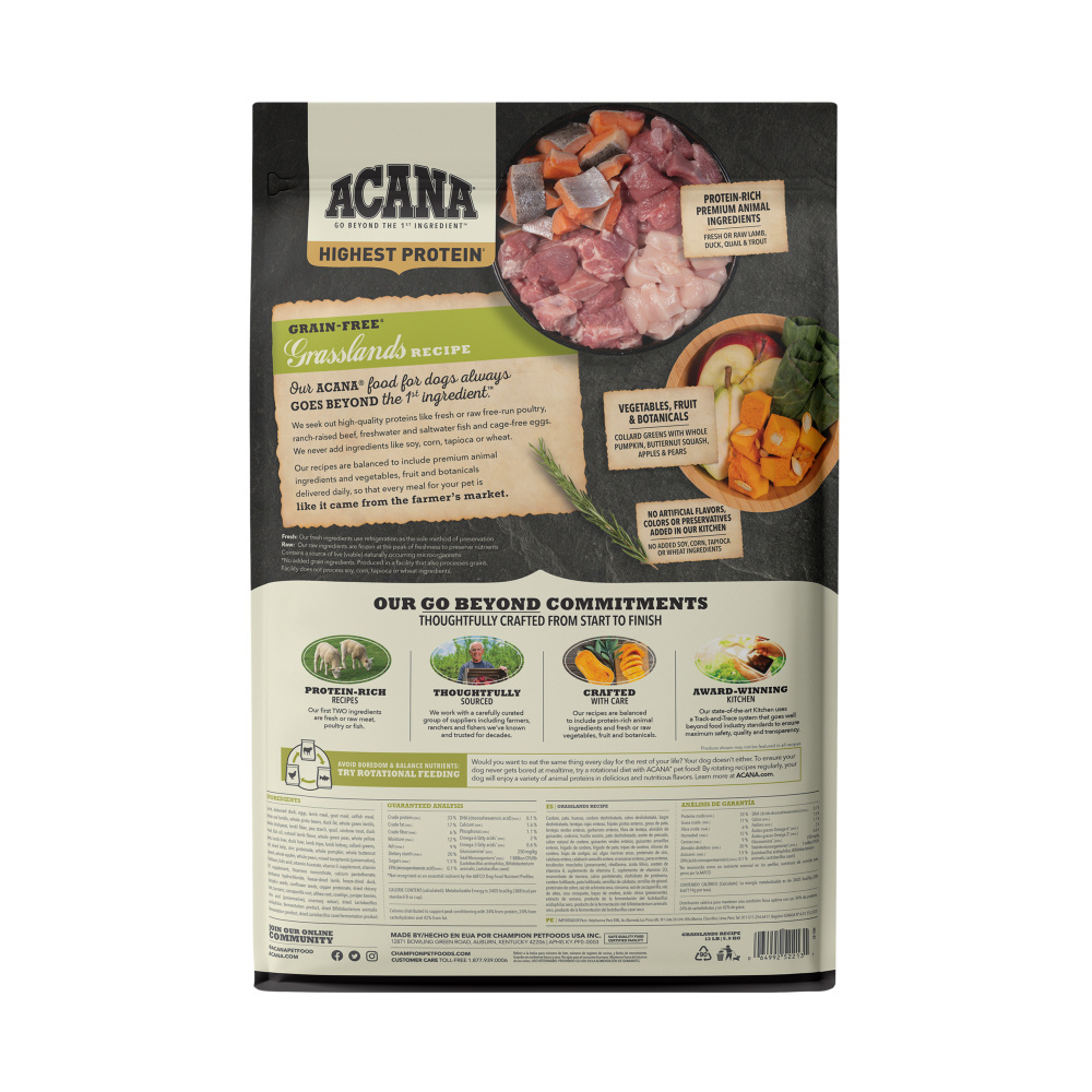 Bring home the quality nutrition your dog needs to thrive with ACANA Grain Free* Grasslands Recipe Dry Dog Food. With the highest protein offering in ACANA pet foods, this high protein dog food is for all life stages, except for growth of large size dogs (70 lb or more as an adult) and includes probiotics and fiber to support healthy digestion. Protein-rich lamb, duck, eggs, quail and rainbow trout are balanced with whole pumpkin, collard greens, butternut squash, apples and pears to offer a nutritious, high-fiber option for your dog. This ACANA dog food is 70 percent** quality animal ingredients and 30 percent*** vegetables, fruit and nutrients. Even better, this grain free* dog food kibble has a freeze dried dog food coating made of lamb and duck for a delicious taste your dog will crave. Choose ACANA dry dog food to give your companion the nutritional foundation they need to live a happy, healthy life. *Produced in a facility that also processes grains **Approximate and derived from the unprocessed state of the ingredients ***We also add vitamins, minerals, natural preservatives, probiotics and antioxidants<h3>Why We Love It</h3><br><ul><li>One (1) 4.5 lb bag of ACANA Grain Free* Grasslands Recipe Dry Dog Food<li>High protein dog food recipe features 70 percent** high-quality animal ingredients and 30 percent*** wholesome vegetables, fruit and nutrients<li>A freeze dried dog food coating adds rich flavor dogs crave</ul>From limited ingredient diets to recipes for all life stages, ACANA® recipes for dogs and cats are thoughtfully crafted from start to finish to ensure that your pet has the high quality, balanced nutrition needed to live a long and happy life.