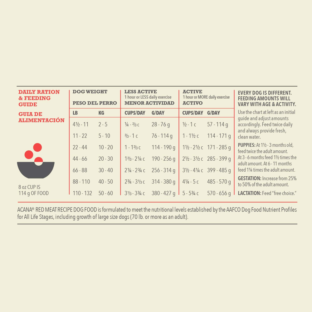 Bring home the quality nutrition your dog needs to thrive with ACANA Grain Free* Red Meat Recipe Dry Dog Food. Protein-rich, Fresh or Raw Farm-Raised Beef, Yorkshire Pork & Raw Lamb are balanced with whole pumpkin, collard greens, apples and pears to offer a delicious, nutritious option for your dog. This ACANA dog food is 60 percent* quality animal ingredients and 40 percent** fruits, vegetables and nutrients. This grain free* dog food kibble has a freeze dried coating made of beef, pork and lamb for a delicious taste your dog will crave. Our included fresh ingredients use refrigeration as the sole method of preservation and our included raw ingredients are frozen at their peak freshness. Choose ACANA grain free* dry dog food to give your companion the nutritional foundation they need to live a happy, healthy life. *Produced in a facility that also processes grains *Approximate and derived from the unprocessed state of the ingredients **We also add vitamins, minerals, natural preservatives flavors and probiotics<h3>Why We Love It</h3><br><ul><li>One (1) 13 lb bag of ACANA Grain Free* Red Meat Recipe Dry Dog Food<li>High protein dog food recipe features 60 percent* high-quality animal ingredients and 40 percent** wholesome fruits, vegetables and nutrients and fiber to help support digestive health<li>A freeze dried coating adds rich flavor dogs crave, while Omega-3 and Omega-6 fatty acids help support healthy skin and a shiny coat</ul>From limited ingredient diets to recipes for all life stages, ACANA® recipes for dogs and cats are thoughtfully crafted from start to finish to ensure that your pet has the high quality, balanced nutrition needed to live a long and happy life.