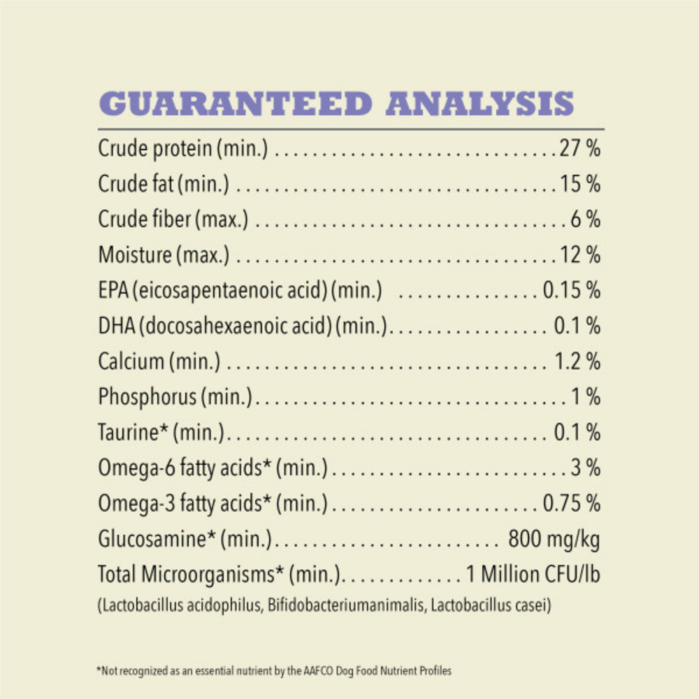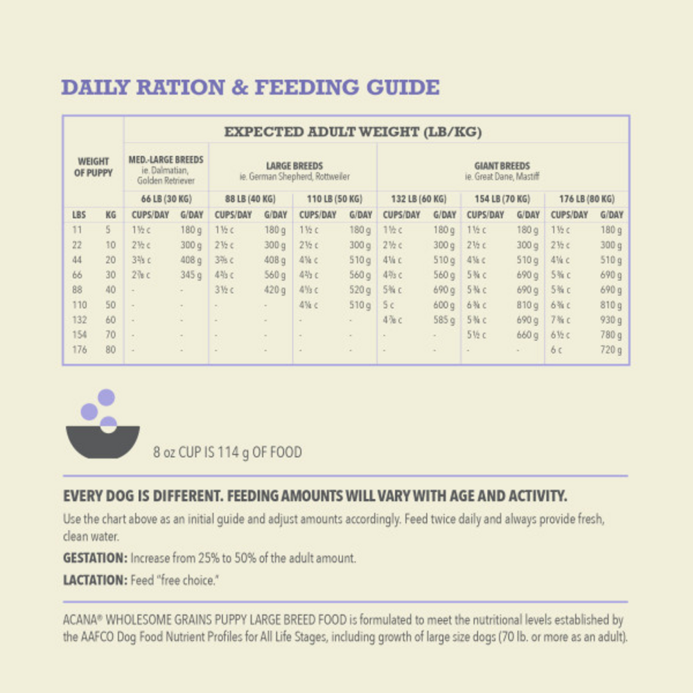Bring home the quality nutrition your puppy needs to thrive with ACANA Wholesome Grains Large Breed Puppy Recipe Dry Dog Food. This high protein dog food is formulated for large breed puppies (70 lb. or more as an adult). Protein-rich fresh or raw free run* chicken and free run* turkey are balanced with fiber-rich grains plus probiotics provide dog digestive support. This dry dog food kibble is 65 percent** animal ingredients and 35 percent*** wholesome grains, fruit and vegetables. The nutritious ingredients in this ACANA dog food support the unique needs of your large breed puppy to provide immune support and aid brain development. Even better, tailored levels of protein, fat and calcium support healthy bone growth and lean muscle development. Our included fresh ingredients use refrigeration as the sole method of preservation and our included raw ingredients are frozen at their peak freshness. Choose ACANA dry dog food kibble today to provide your growing puppy with the nutritional foundation they need to live a healthy, happy life. *Our free-run chickens and turkeys are not housed in cages and are able to move in a barn without outdoor access. **Approximate and derived from the unprocessed state of the ingredients ***We also add vitamins, minerals, natural preservatives, flavors and probiotics