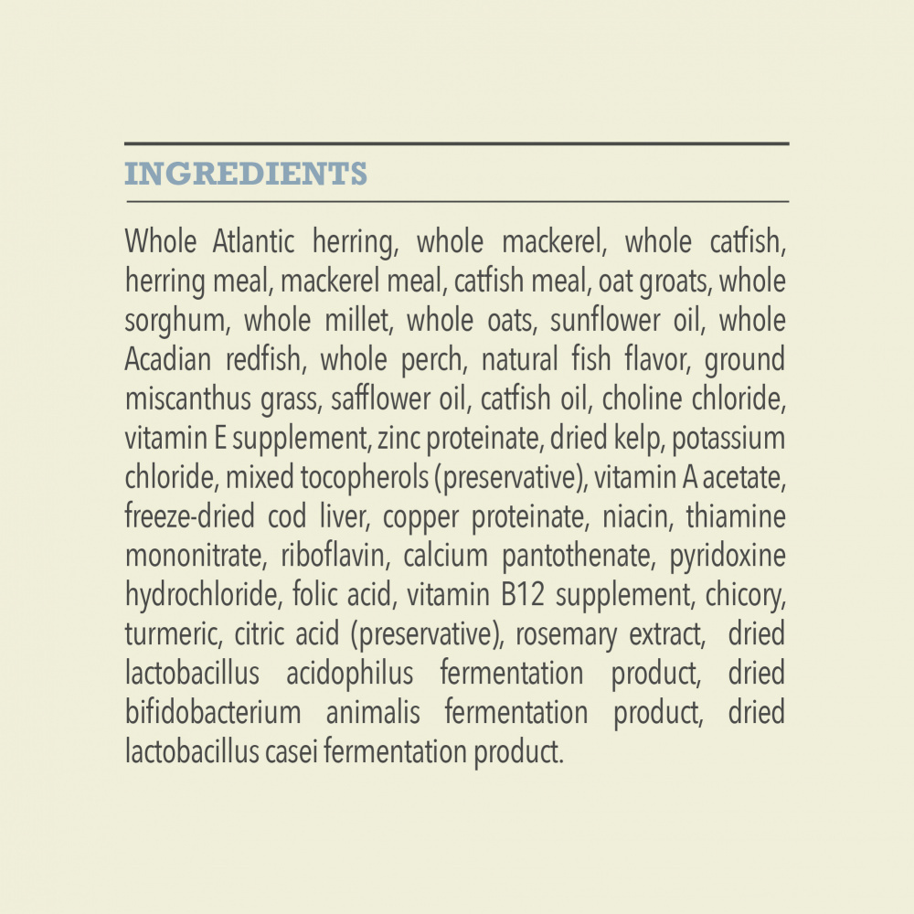 Bring home quality nutrition your dog needs to thrive with ACANA Wholesome Grains Sea to Stream Fish & Grains Recipe Dry Dog Food. This high protein dog food kibble is for all life stages except for the growth of large size dogs (70 lb or more as an adult) and includes pre- and probiotics. Wild-caught herring, mackerel and catfish are balanced with wholesome grains like oats, sorghum and millet. This ACANA dog food is 70 percent* quality animal ingredients and 30 percent** wholesome grains, fruits, vegetables and nutrients. Even better, antioxidant-rich ingredients help provide immune support for dogs while Omega-3 and Omega-6 fatty acids help support dogs' healthy skin and shiny coat. A freeze dried dog food coating adds delicious flavor your dog craves. *Approximate and derived from the unprocessed state of the ingredients **We also add vitamins, minerals, natural preservatives flavors and probiotics ***Our included fresh ingredients use refrigeration as the sole method of preservation and our included raw ingredients are frozen at their peak freshness<h3>Why We Love It</h3><br><ul><li>One (1) 22.5 lb bag of ACANA Wholesome Grains Sea to Stream Fish & Grains Recipe Dry Dog Food<li>High protein dog food recipe features wild-caught herring, mackerel and catfish and is balanced to include 70 percent* high-quality animal ingredients and 30 percent** wholesome grains, fruits, vegetables and nutrients<li>A fiber-rich grain blend, featuring oats, sorghum and millet, plus pre- and probiotics for dogs, helps provide dog digestive support</ul>From limited ingredient diets to recipes for all life stages, ACANA® recipes for dogs and cats are thoughtfully crafted from start to finish to ensure that your pet has the high quality, balanced nutrition needed to live a long and happy life.