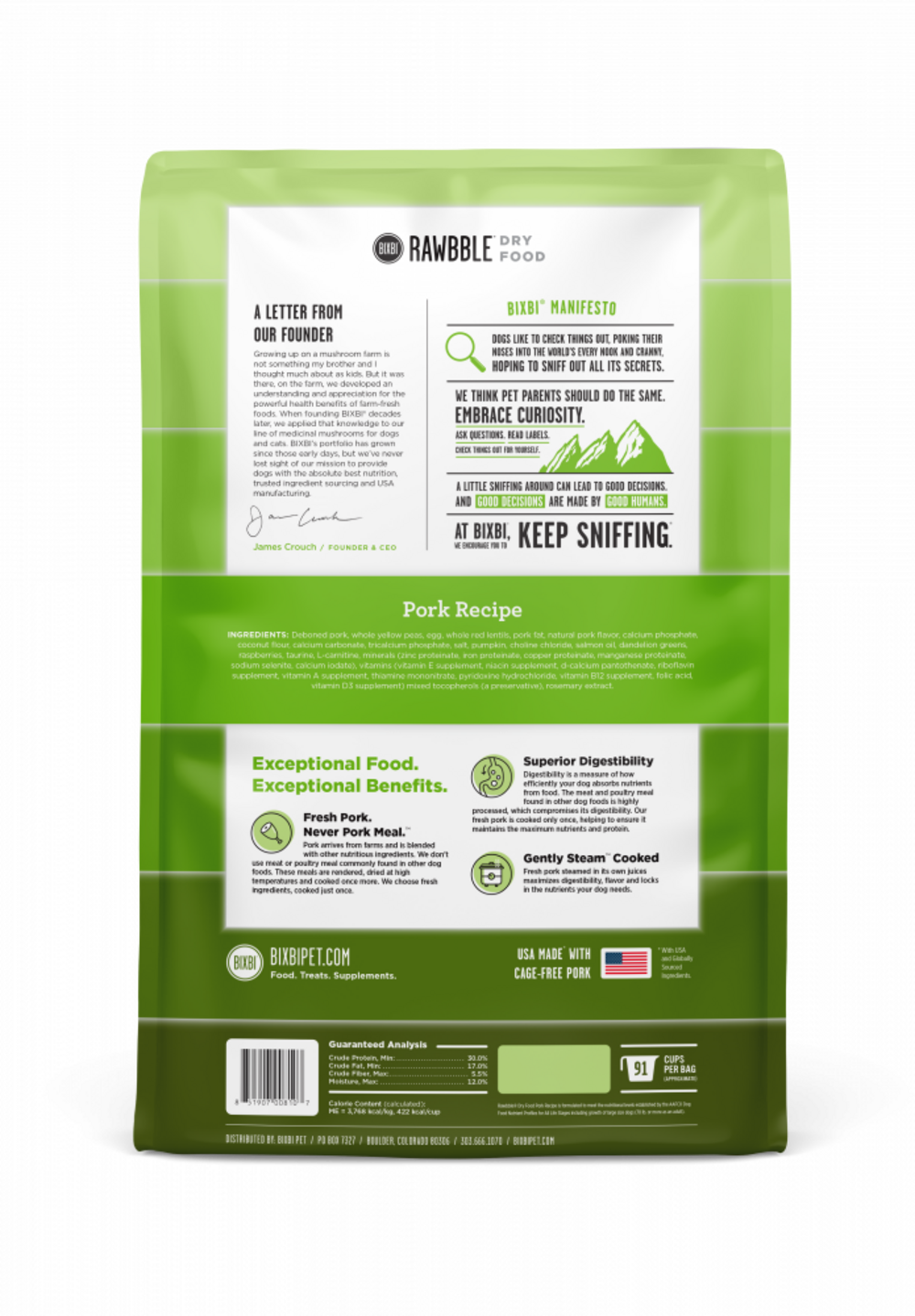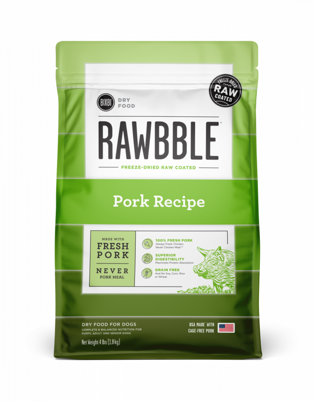 <p>Our Freeze Dried Raw coated, fresh meat, no meat meals dry dog food line RAWBBLE® was developed with your dog's health in mind. We selected ingredients for gut, renal and colon health while maintaining the awesome flavor you and your pup have come to know from BIXBI. Protein from fresh Pork, and carbohydrates from lentils and whole peas replace commonly found ingredients like meals, pea protein powder, potato or rice. This new low glycemic diet optimizes amino acid absorption, offers balanced fiber levels and presents the right quality and quantity of fresh meat proteins.<br><h3>Why We Love It</h3><ul><li>Freeze-Dried Raw Coated<li>Minimally Processed and Locally Sourced for Optimal Protein Levels<li>Limited Ingredient Diets with Single Source Protein resulting in Superior Digestibility with Average of 90%</ul><p><br><h3>About Bixbi</h3><p>Real ingredients provide the taste pets crave so every product BIXBI produces is thoughtfully sourced, made with minimal processing and is rigorously tested for safety and quality. Our commitment is not to a boardroom. Our commitment is to your pet's health and wellbeing and we honor that commitment every day. There are easier ways to do things, that's for sure. But when BIXBI creates products, we don't look to simply make a pretty bag filled with whatever. We want to change the way people think about ingredients, processes and quality. Keep Sniffing!