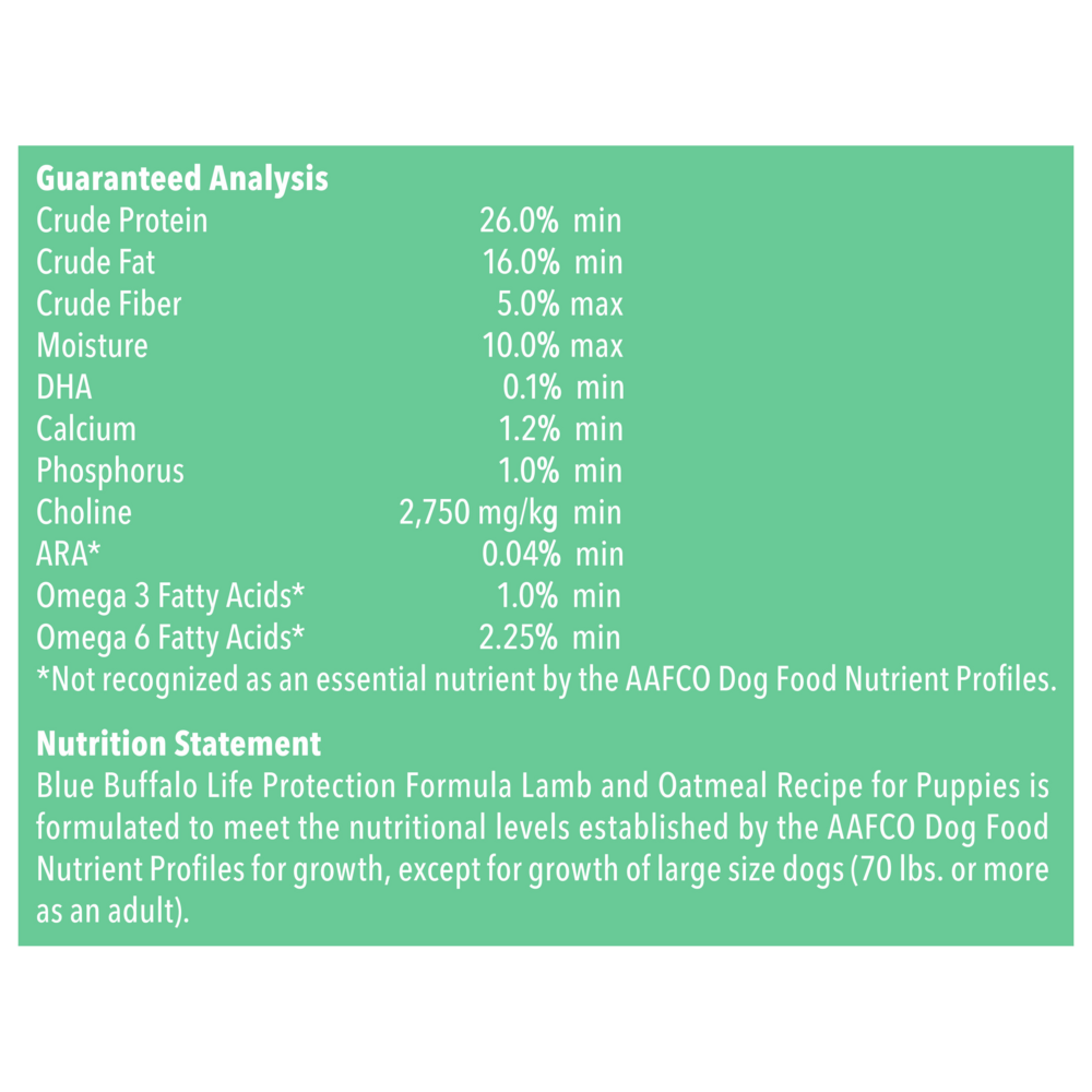 <p>Because puppyhood is such an important stage in any dog’s life, BLUE Life Protection Formula for puppies features ingredients that support the healthy growth and development of puppies. It contains the ingredients you’ll love feeding as much as they’ll love eating. BLUE Life Protection Formula dog food is a product of the Blue Buffalo company. Based in the United States, Blue Buffalo makes premium-quality pet foods featuring real meat, fruit and vegetables.<br><h3>Why We Love It</h3><ul><li>REAL MEAT FIRST: Blue Buffalo foods always feature real meat as the first ingredient. High-quality protein from real lamb helps your dog build and maintain healthy muscles. Plus they contain wholesome whole grains, garden veggies and fruit.<li>FOR PUPPY DOGS: Specially formulated for puppies, BLUE Life Protection Formula® Puppy Food contains DHA and ARA (important fatty acids found in mother’s milk) to support cognitive function and retinal health.<li>WITH LIFESOURCE BITS®: This formula contains BLUE’s exclusive LifeSource Bits – a precise blend of antioxidants, vitamins and minerals carefully selected by holistic veterinarians and animal nutritionists, to support immune system health, life stage requirements, and a healthy oxidative balance.<li>A NATURAL DOG FOOD: BLUE dry dog foods are made with the finest natural ingredients enhanced with vitamins and minerals. BLUE contains NO chicken (or poultry) by-product meals, corn, wheat, soy, artificial flavors or preservatives.</ul><p><br><h3>About Blue Buffalo</h3><p>BLUE Buffalo's True Blue promise is the pillar of their business, straight to every customer; the finest natural ingredients, and no chicken/poultry by-product meals, corn, wheat, soy, artificial preservatives, colors or flavors. BLUE Buffalo is the only food made with unique Lifesource Bits; a precise blend of vitamins, minerals and antioxidants created by veterinarians and animal nutritionists. With recipes for all tastes and diets, including limited ingredient diets, high protein, grain-free, wholesome grains, and exotic proteins, BLUE Buffalo always starts with real meat, and ends with good health.