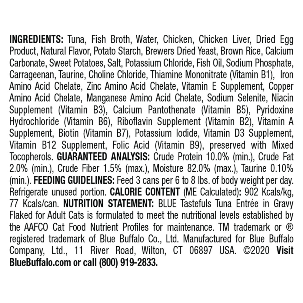 <p>BLUE Tastefuls cat food is so delicious, your cat will keep coming back for more. This wet cat food starts with tender flakes of high-quality tuna, plus brown rice and sweet potatoes in savory gravy. Made from the finest natural ingredients enhanced with vitamins, minerals and other nutrients, Tastefuls canned cat food has the great taste cats want with the healthy ingredients you prefer feeding. Let your cat try this mouthwatering flaked entrée to see why one taste is all it takes!<br><h3>Why We Love It</h3><ul><li>DELICIOUS TUNA FIRST: The first ingredient in this BLUE Tastefuls cat food recipe is protein-rich tuna to support healthy muscle maintenance ; SAVORY FLAKED ENTRÉE: Tastefuls flaked wet cat food in savory gravy is so flavorful even finicky felines will come back for more. One taste is all it takes!<li>BLUE Buffalo's True Blue promise is the pillar of their business, straight to every customer; the finest natural ingredients, and no chicken/poultry by-product meals, corn, wheat, soy, artificial preservatives, colors or flavors. BLUE Buffalo is the only food made with unique Lifesource Bits; a precise blend of vitamins, minerals and antioxidants created by veterinarians and animal nutritionists. With recipes for all tastes and diets, including limited ingredient diets, high protein, grain-free, wholesome grains, and exotic proteins, BLUE Buffalo always starts with real meat, and ends with good health.<li>WET CAT FOOD: BLUE canned cat food has high moisture content, which can help cats get their daily hydration</ul><p><br><h3>About Blue Buffalo</h3><p>BLUE Buffalo's True Blue promise is the pillar of their business, straight to every customer; the finest natural ingredients, and no chicken/poultry by-product meals, corn, wheat, soy, artificial preservatives, colors or flavors. BLUE Buffalo is the only food made with unique Lifesource Bits; a precise blend of vitamins, minerals and antioxidants created by veterinarians and animal nutritionists. With recipes for all tastes and diets, including limited ingredient diets, high protein, grain-free, wholesome grains, and exotic proteins, BLUE Buffalo always starts with real meat, and ends with good health.