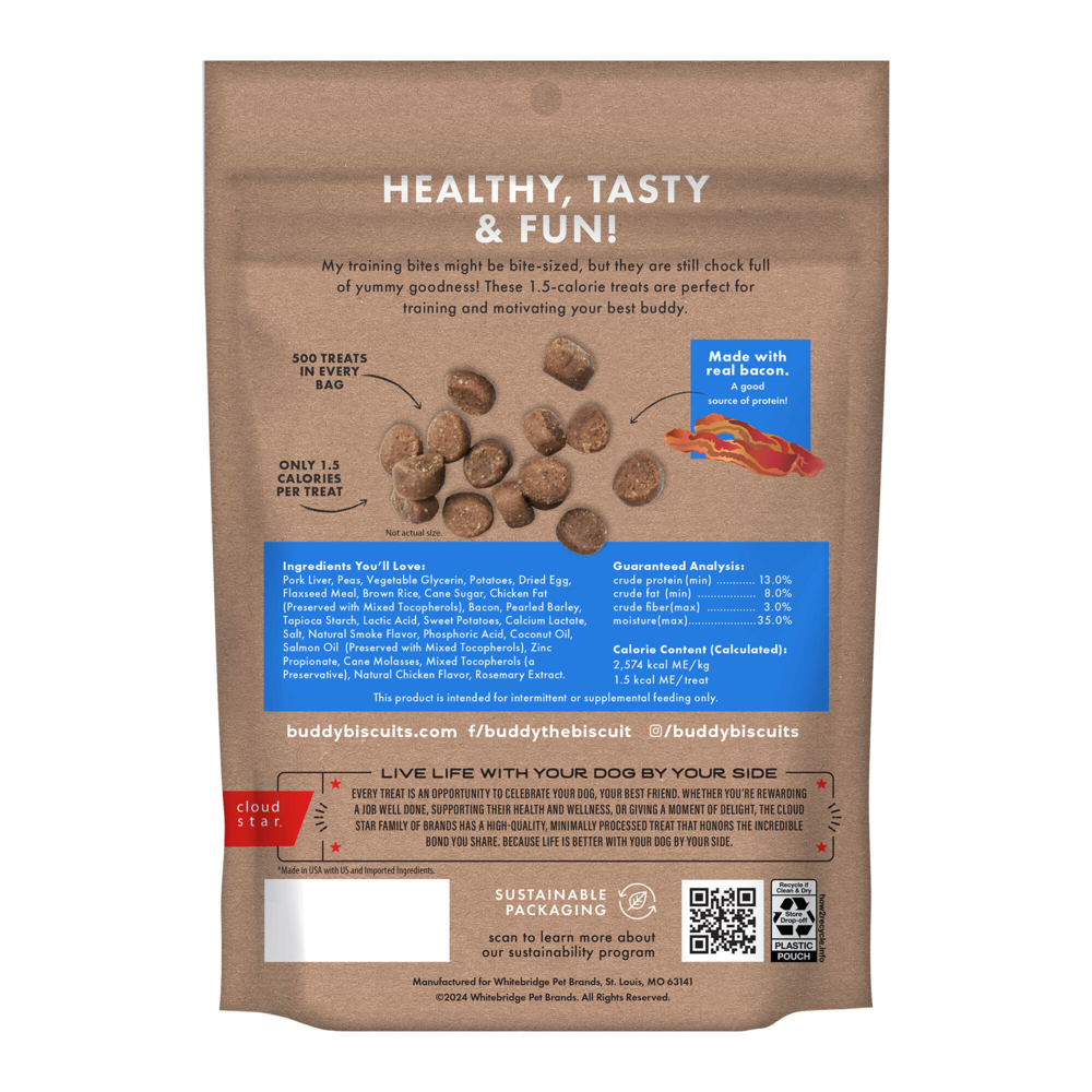 Buddy Trainers Training Bites with natural bacon are the perfect training treat to reward and motivate your dog. There are over 500 treats in every bag and each piece is highly palatable with a pork liver base and only 1.5 calories. Buddy makes training a breeze
