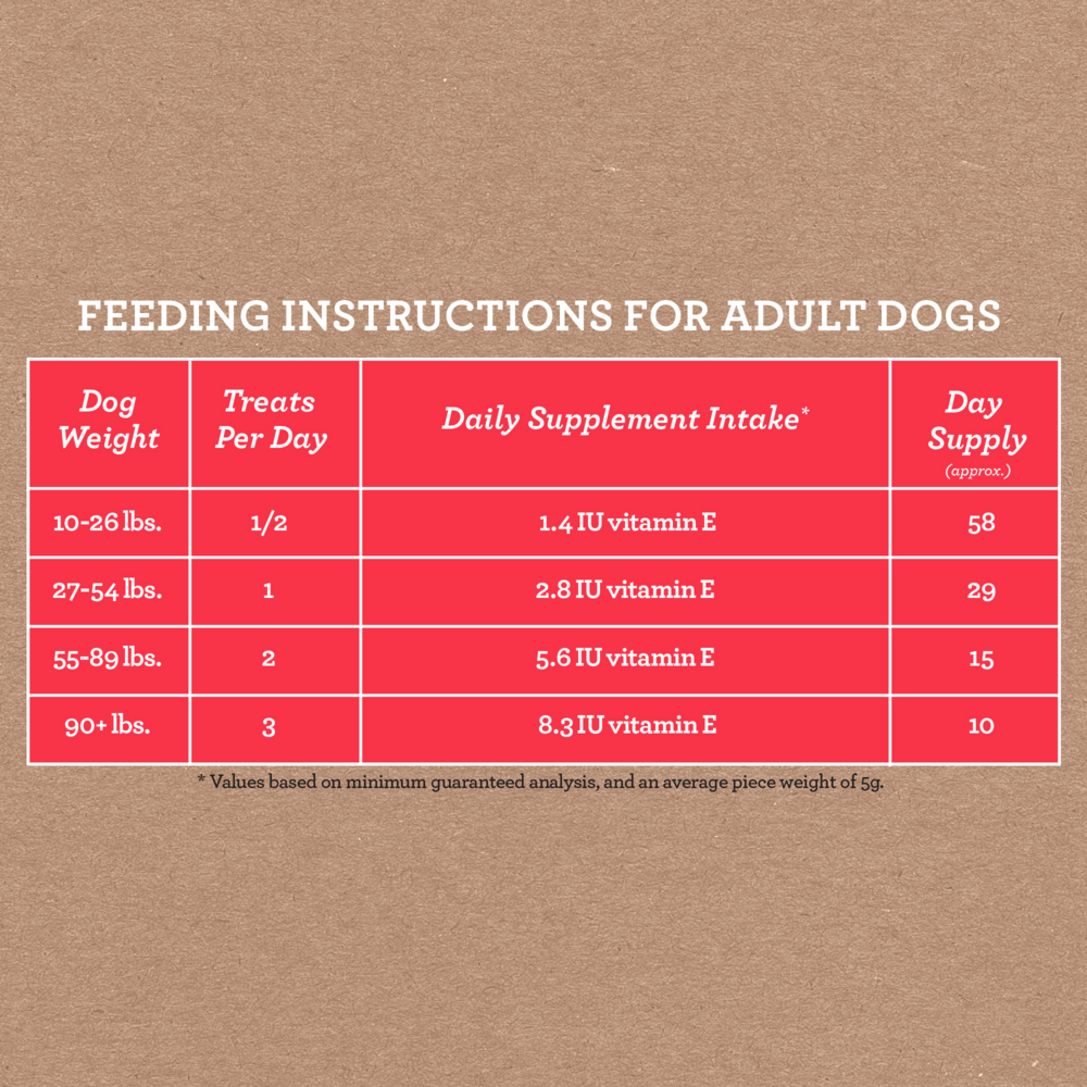 Promoting healthy skin and coat is easy with these grain free, gluten free treats that are rich in salmon oil and vitamin E. No grain, gluten, corn, or soy. Soft-textured treats with a daily measured dose of supplementation for your dog's weight. With salmon, salmon oil and vitamin E for a luxurious coat and healthy skin.