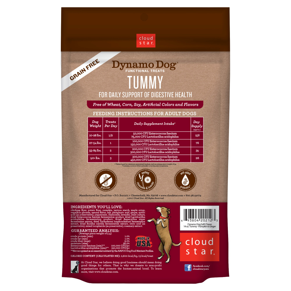 Cloud Star Dynamo Dog Functional Soft Chews are a fun and functional way to support your dog’s specific needs. Each Functional Soft Chew is made with simple, recognizable ingredients fortified with a daily dose of supplementation for an extra boost of “healthy” in every bite. Supports healthy digestion and soothes sensitive stomachs in all dogs. Made with natural pumpkin and ginger to ease digestion. Helps Support Hip & Joint Health