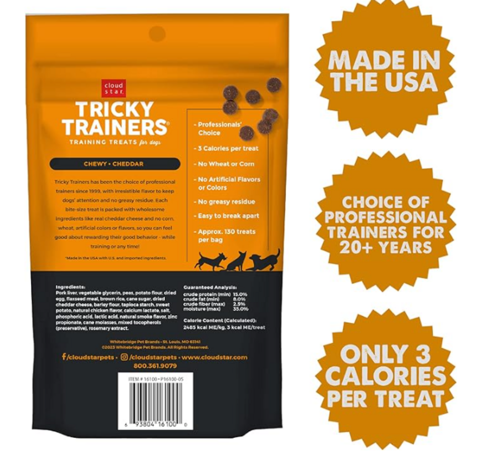 Cloud Star Tricky Trainers has been the choice of professional trainers since 1999, with irresistible flavor to keep dogs’ attention, low calories, and deliciously soft and chewy texture. Each bite size treat is packed with wholesome ingredients like natural cheddar cheese, and no corn, wheat, artificial colors or flavors, so you can feel good about rewarding their good behavior while training or any time! Professional trainers use and recommend Tricky Trainers for dog training & behavior aids. Ideal for small, medium, and large breeds, these tiny, low calorie treats won’t fill them up or cause weight gain. Perfect for long training sessions with 360 treats per bag! Helps Support Hip & Joint Health