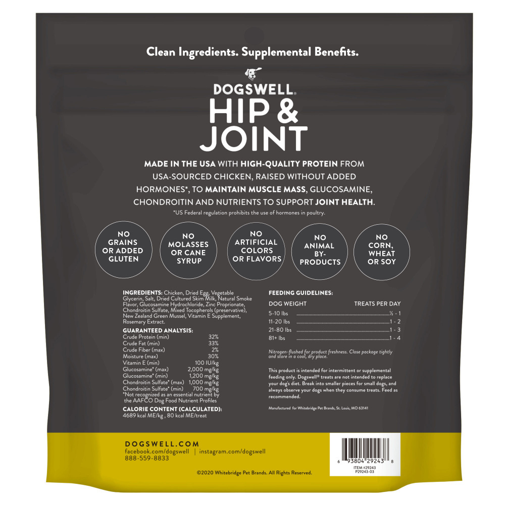 Support your dogs active lifestyle with a chewy meaty treat that tastes good and does good. High quality protein from real chicken maintains muscle mass and delivers a smoky grilled flavor dogs love while glucosamine chondroitin and nutrients work to promote your dogs hip and joint health now and into the future.