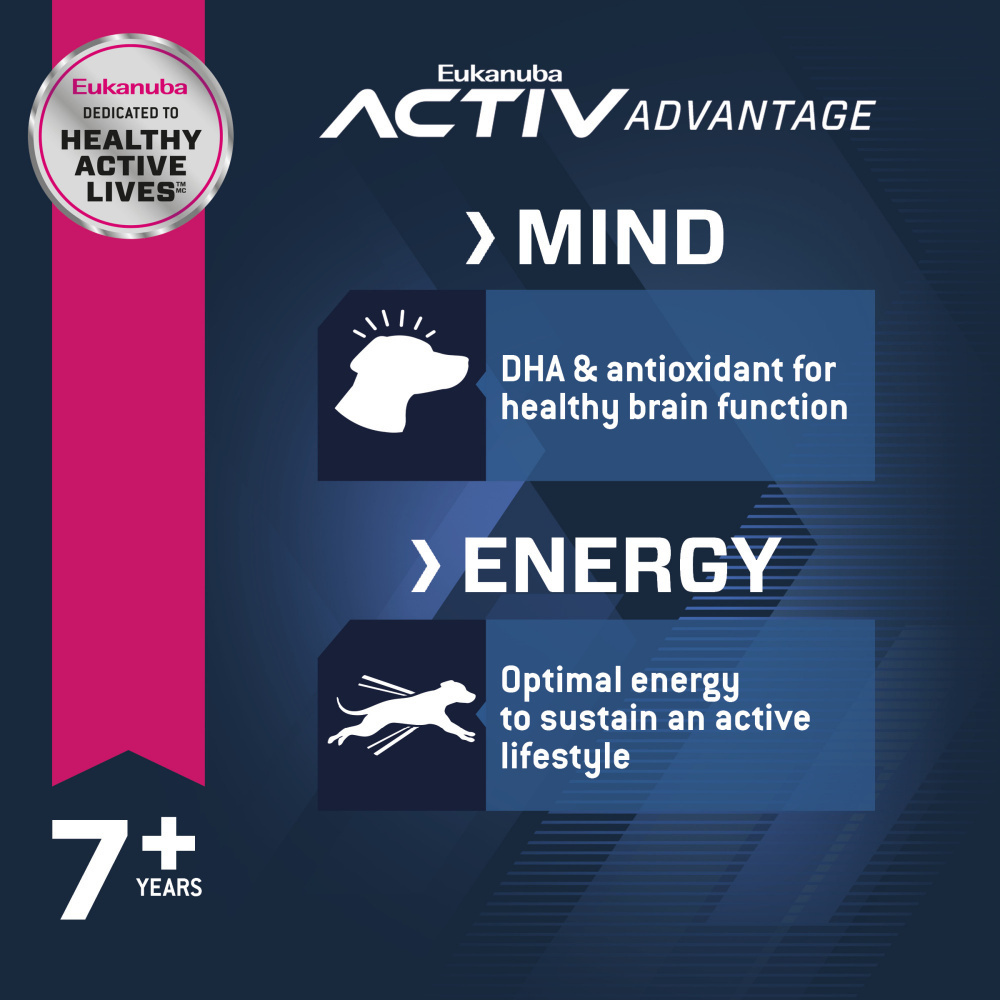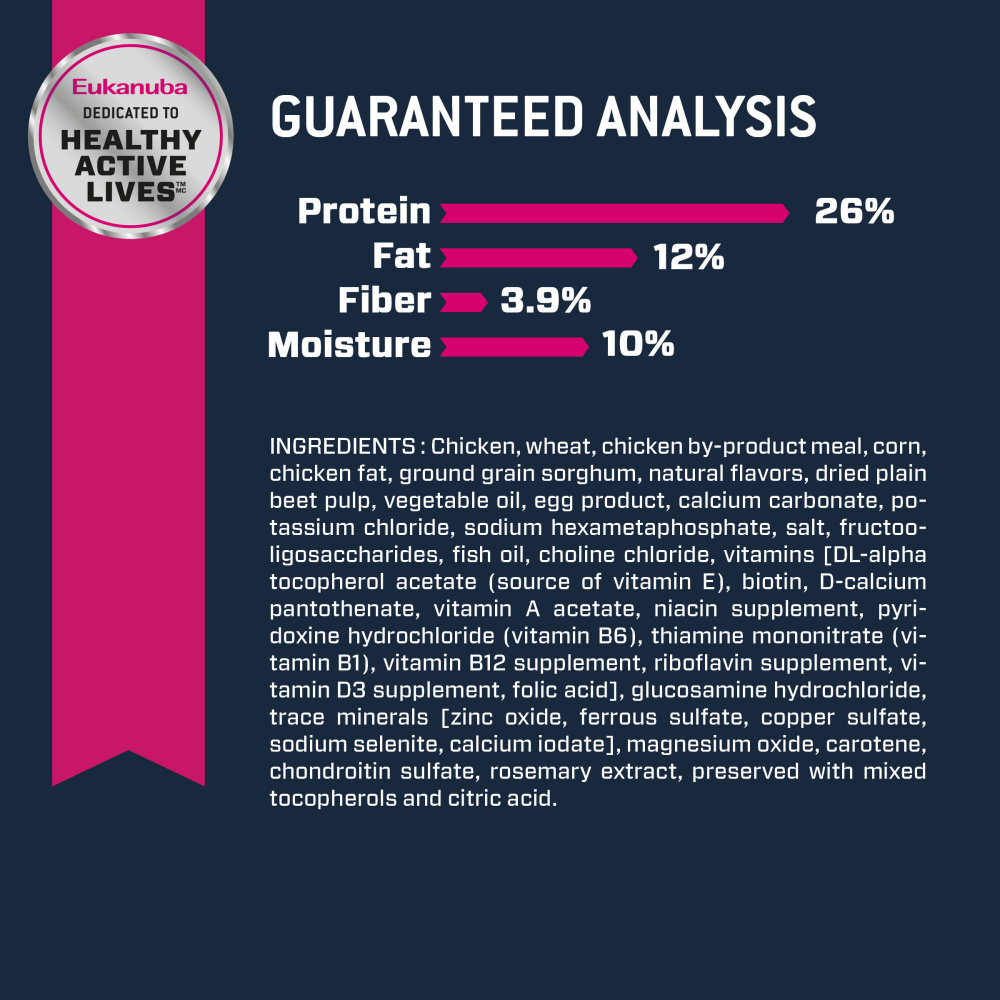 Your big dog is up for anything—from running to hiking to fetching—and it’ll take more than age to slow them down. Power their active lifestyle with Eukanuba Senior Large Breed dry dog food, a diet created specifically for your dog’s body, mind, and energy. High-quality chicken is always the first ingredient, because your lively senior deserves high-quality protein. Help keep your senior dog’s joints and muscles limber with glucosamine and chondroitin sulfate, and help them stay sharp with DHA and antioxidants to support healthy brain function. This diet is formulated with optimal amount of fats and carbohydrates to help maintain your older dog’s energy levels, while Eukanuba 3D DentaDefense reduces tartar buildup to keep their teeth and gums healthy. This diet also provides immune system support to help strengthen your dog's natural defenses. Pair it with Eukanuba Adult Wet Dog Food for the perfect complement to your active dog’s diet. Your big dog has a big appetite and even bigger dreams, so feed them Eukanuba Senior Large Breed dry dog food and make their golden years the best adventure yet—satisfaction guaranteed.<h3>Why We Love It</h3><br><ul><li>FOR LARGE BREED SENIOR DOGS: Eukanuba Senior Large Breed Dry Dog Food is complete and balanced nutrition for senior dogs over 7 years old weighing over 55 lb.<li>MUSCLE & JOINT SUPPORT: Chondroitin sulfate and 50% more glucosamine (vs. Eukanuba Adult Medium Breed Dry Dog Food) help keep joints mobile and support lean muscles in large dog breeds<li>HEALTHY BRAIN FUNCTION: DHA and antioxidants support healthy brain function in senior dogs<li>SUPPORTS SENIOR DOGS: Optimal levels of fats and carbohydrates fuel your active senior dog’s daily activity levels<li>MAINTAINS NATURAL DEFENSES: Guaranteed antioxidant levels for older dogs help maintain your dog’s natural defense</ul>