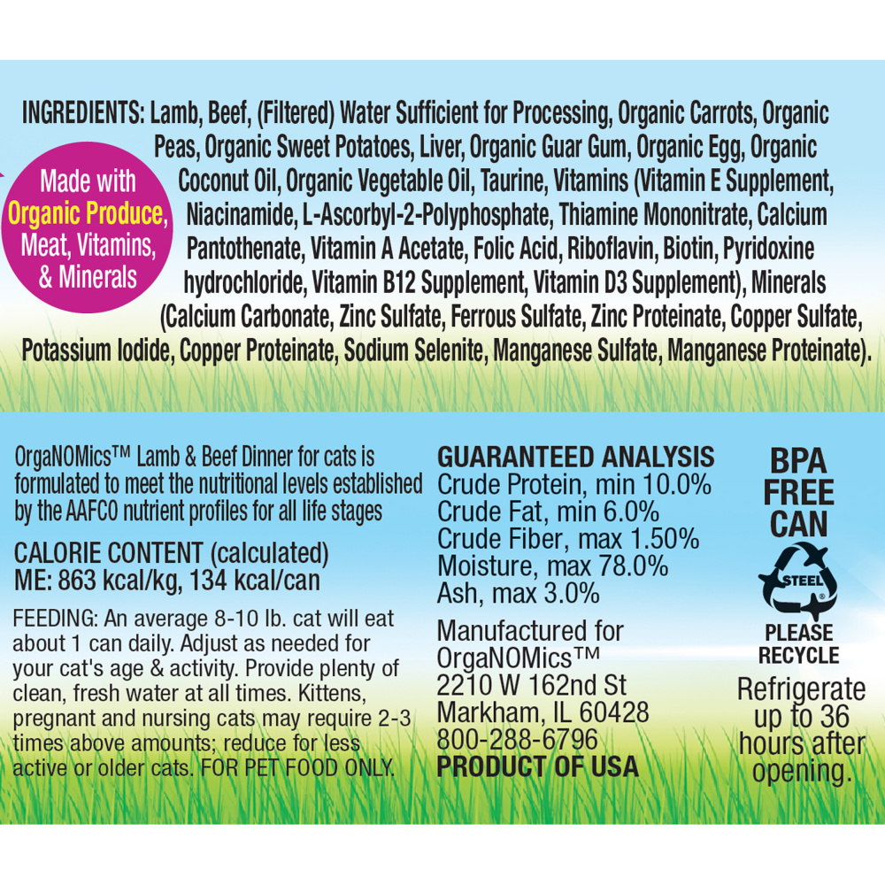 Tender lamb and beef are served in a pate style with a side of organic produce to make up this clean and green NOM for finicky felines.