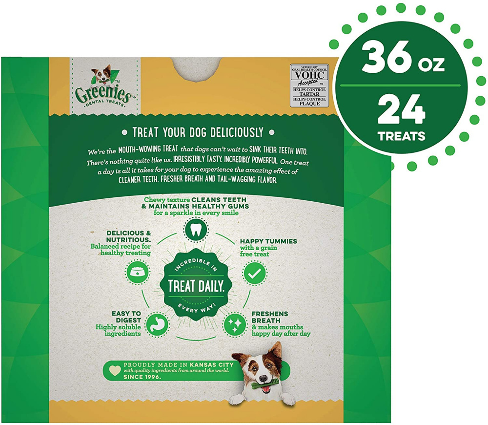 <p>One GREENIES Grain-Free Dental Treat is all it takes for clean teeth, fresh breath, and a happy dog. Featuring dried potatoes, plus a delightfully chewy texture that fights plaque and tartar, your dog can't wait to sink their teeth into these no-grain dog treats. Irresistibly tasty and incredibly powerful, GREENIES Treats for Dogs are vet-recommended for at-home oral health care. Best of all, these natural dog treats are made with highly soluble ingredients that are easy for large breeds to digest. Give your dog the mouth-wowing treat that helps promote their overall health with GREENIES Dog Treats. Natural Dog Treats Plus Vitamins, Minerals, and Other Nutrients.<br><h3>Why We Love It</h3><ul><li>Contains one (1) 36 oz. 24-count pack of GREENIES Grain Free Large Natural Dental Dog Treats<li>Natural Dog Treats Plus Vitamins, Minerals, and Other Nutrients</ul><p><br><h3>About Greenies</h3><p>As loving pet owners ourselves, the health and well-being of our pets is always our top priority. That’s why we make all GREENIES™ Dental Treats with delicious, healthy ingredients that are easy to digest and help promote overall pet health. As the popularity of natural pet food continues to grow, more and more pet food manufacturers are putting the term “natural” on their product labels. We understand that there is often confusion about what the term actually means for pet food products like GREENIES™ Dental Treats.