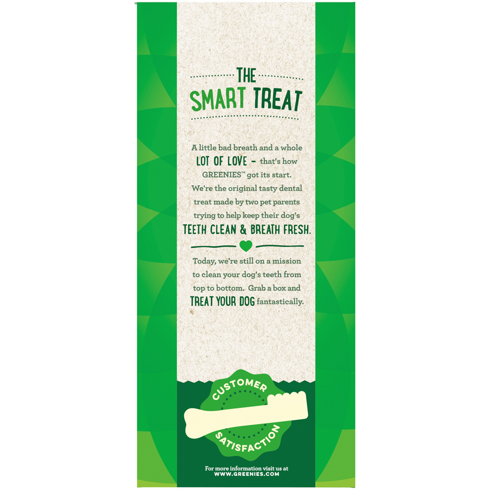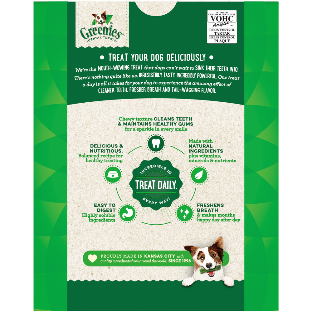 <p>One GREENIES Original Dental Treat a day is all it takes for clean teeth, fresh breath and a happy dog. Your dog can't wait to sink their teeth into these delicious, original-flavor dental dog chews because they feature a delightfully chewy texture that fights plaque and tartar. Irresistibly tasty and incredibly powerful, GREENIES Treats for Dogs are recommended by veterinarians for at-home oral care. Best of all, these natural dog treats are made with highly soluble ingredients that are safe and easy to digest. Give your dog the mouth-wowing treat that helps promote their overall health with GREENIES Dog Treats. Natural Dog Treats Plus Vitamins, Minerals and Other Nutrients.<br><h3>Why We Love It</h3><ul><li>Contains one (1) 12 oz. 8-count pack of GREENIES Original Large Natural Dental Dog Treats<li>Natural Dog Treats Plus Vitamins, Minerals and Other Nutrients</ul><p><br><h3>About Greenies</h3><p>As loving pet owners ourselves, the health and well-being of our pets is always our top priority. That’s why we make all GREENIES™ Dental Treats with delicious, healthy ingredients that are easy to digest and help promote overall pet health. As the popularity of natural pet food continues to grow, more and more pet food manufacturers are putting the term “natural” on their product labels. We understand that there is often confusion about what the term actually means for pet food products like GREENIES™ Dental Treats.