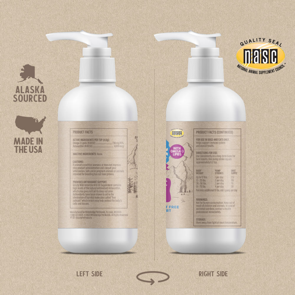 Grizzly Krill Oil Liquid Antioxidant Product is an obvious choice for anyone wanting to safeguard their pet against the harmful actions of free radicals the unstable molecules created primarily during digestion. The inherent antioxidants in Grizzly Krill Oil also help support the health of your pet?s liver, ocular, respiratory, cardiovascular and vascular functions, as well as helping to maintain good health in all the body?s cells and tissues.