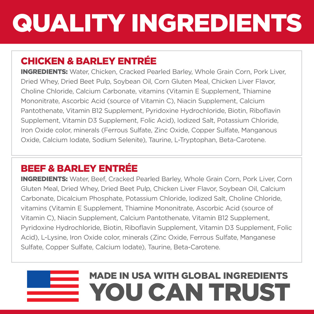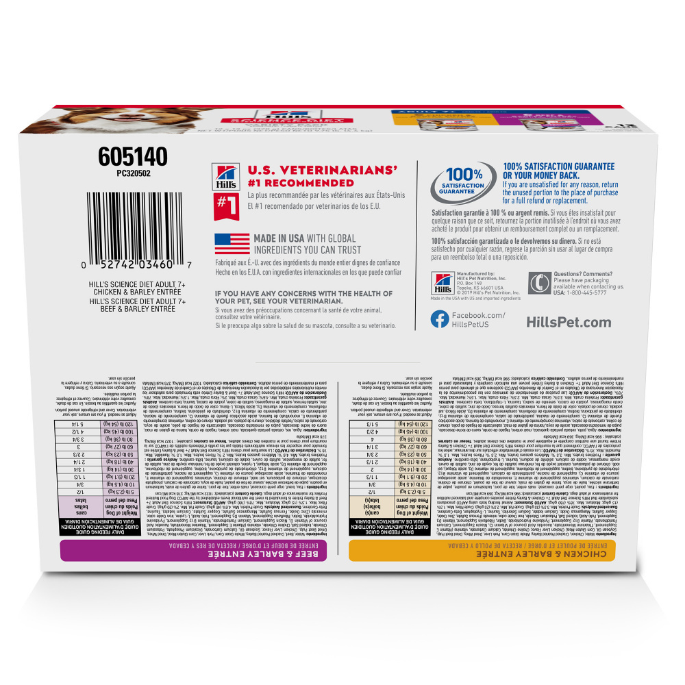 Indulge your dog in tail-wagging delight with the two tasty flavors in this Science Diet variety pack. Both flavors of this delicious dog food have precise nutrition to support the energy and activity level of adult dogs age 7+. Made in the USA with global ingredients you can trust, these foods also use clinically proven antioxidants for a healthy immune system. Open up a can and serve either one of these mouthwatering entrées as a balanced meal, or try on top of Science Diet dry dog food. Biology-based nutrition of Science Diet in a delicious wet dog food Variety pack of 12 cans in two flavors for adult dogs age 7+ High-quality protein for lean muscles • Balanced minerals for heart and kidney health • Purposeful ingredients for a flavorful, nutritious meal that’s easy to digest • Made in the USA with global ingredients you can trust • From Hill’s, the #1 Veterinarian Recommended pet food brand