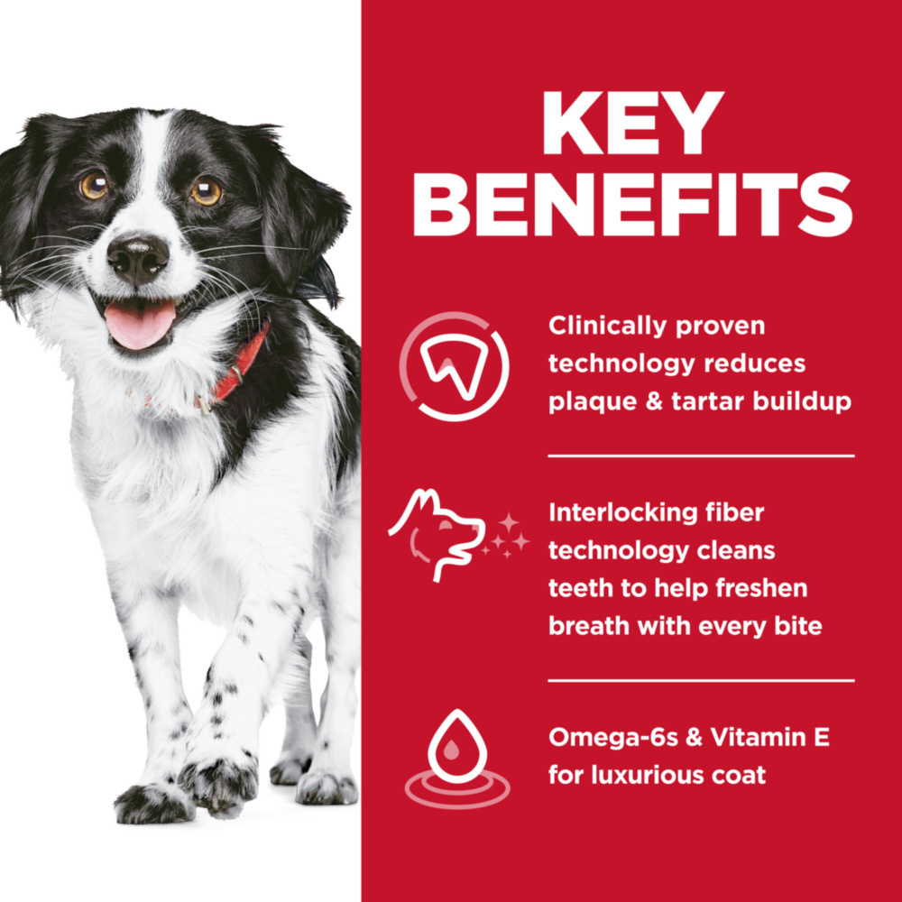 Dog dental health affects so much more than just the teeth. Help support overall health and vitality in your adult dog with Hill's Science Diet Oral Care Adult Small & Mini Dog Food. Designed with a unique, clinically proven interlocking fiber technology, this unique kibble works to clean dog teeth and freshen breath with every bite. Plus, this premium dog food made with natural ingredients is packed with Omega-6 fatty acids & Vitamin E to help your grown dog keep a healthy coat and skin each and every day. This recipe is formulated with decades of cutting-edge research to be a great-tasting dog food your adult dog can truly enjoy. Clinically proven technology reduces plaque & tartar build-up. Interlocking fiber technology cleans teeth to help freshen breath with every bite. Natural ingredients with added vitamins, minerals and amino acids. For more than 75 years, Hill's Pet Nutrition has helped enrich and lengthen the special relationship between people and their pets by putting their passion for the health and happiness of animals into everything they do. They even partner with shelters to provide Hill's food to more than 12 million shelter pets over the past 20 years.