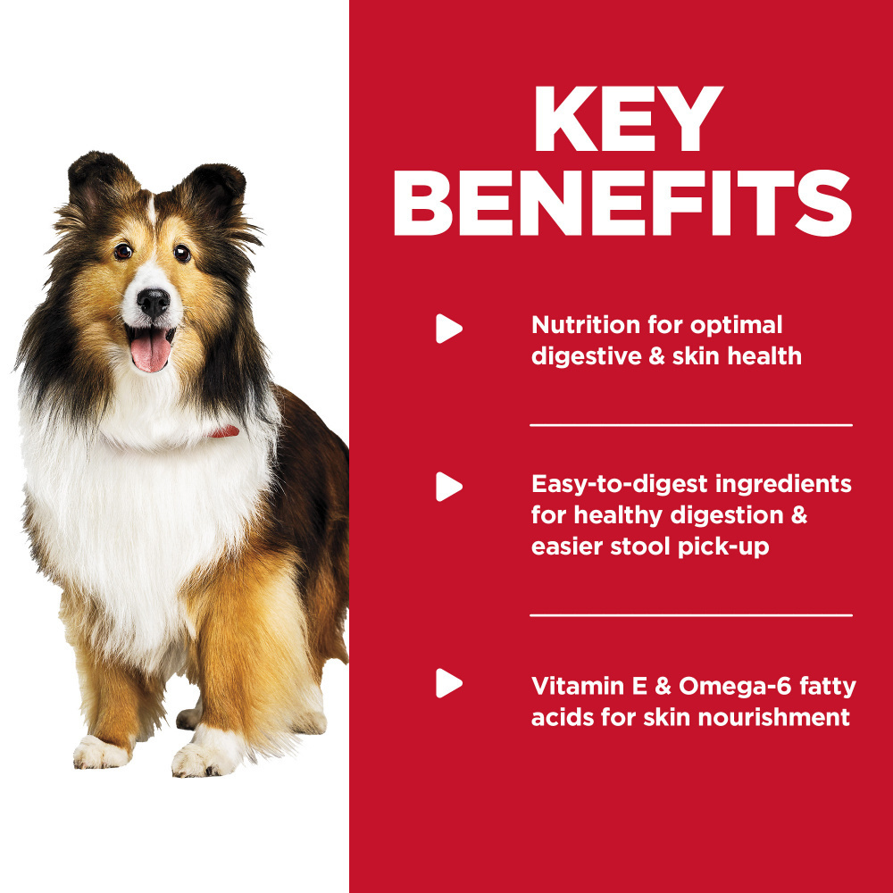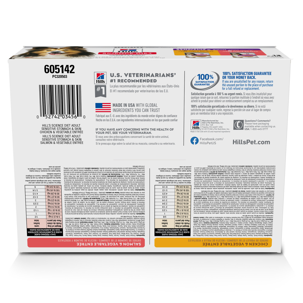 Support your dog’s stomach and skin health plus make their mealtime delicious at the same time with the two flavors in this Science Diet Sensitive Stomach & Skin variety pack. Made in the USA with global ingredients you can trust, both flavors of this tasty dog food support digestive health, nourish skin and promote a lustrous coat. Open up a can and serve either one of these mouthwatering entrees as a balanced meal, or try on top of Science Diet dry dog food. Nutrition for adult dogs to help support optimal digestive and skin health • Variety pack of 12 cans of dog food in two delicious flavors • Easy-to-digest ingredients for healthy digestion and easier stool pick up • Vitamins and fatty acids for skin nourishment • Promotes a lustrous coat • Made in the USA with global ingredients you can trust • From Hill’s, the #1 Veterinarian Recommended pet food brand
