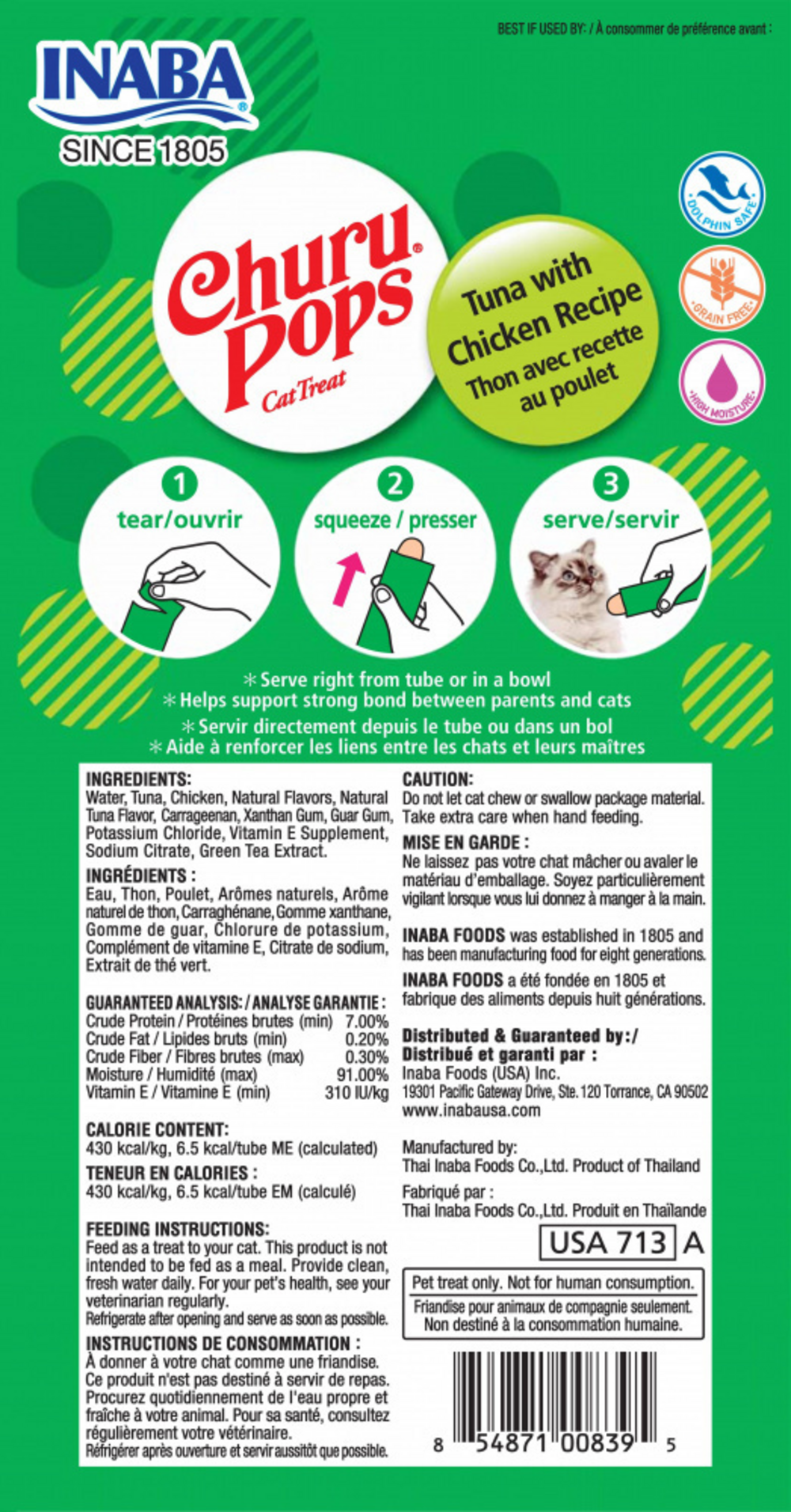 <p>These juicy and tasty treats for cats are made with 100% pure and natural wild tuna or farm-raised chicken! Available in three delectable varieties, Churu® Pops are high in moisture felines need for health.<br><h3>Why We Love It</h3><ul><li>Come in juicy gelée<li>Made with 100% pure and natural wild tuna and farm-raised chicken<li>No grains, preservatives or artificial colors<li>Juicy texture and savory flavors cats love<li>High in moisture cats need for general health</ul><p><br><h3>About Inaba</h3><p>INABA is deeply rooted in a family tradition of excellence that has continued for generations. Since 1958, pet parents have entrusted us with the privilege of providing food that is human grade, nutrient rich, and guarantees feline fun. We are committed to the future of feline health while recognizing that food is one of life’s greatest joys for people and pets.