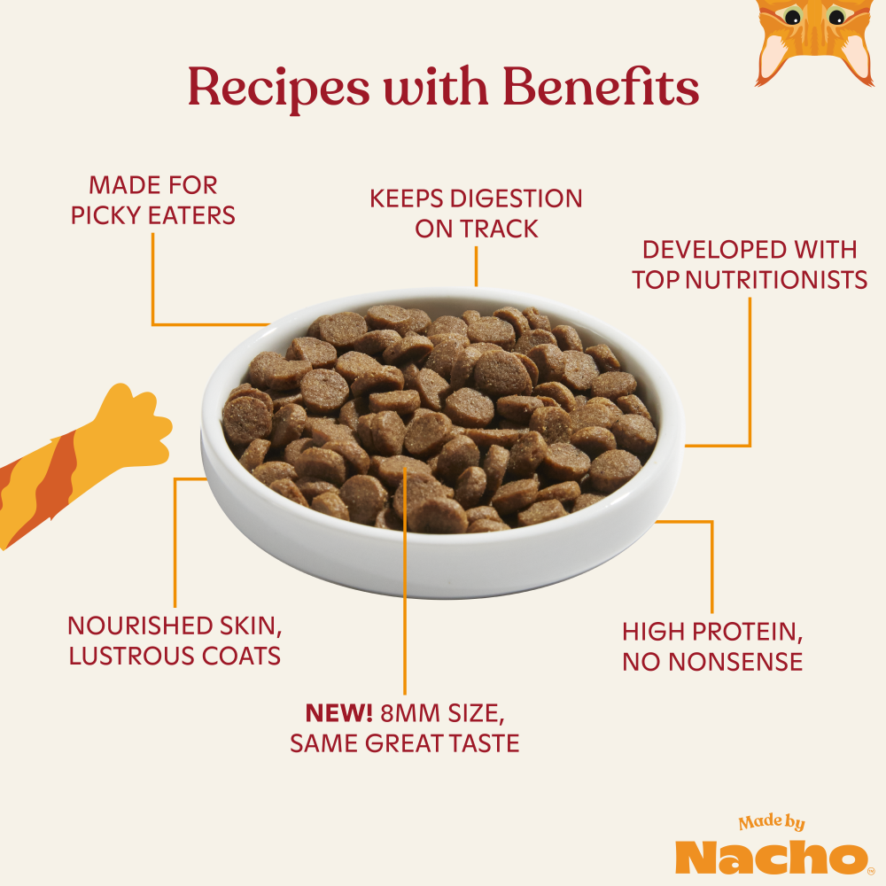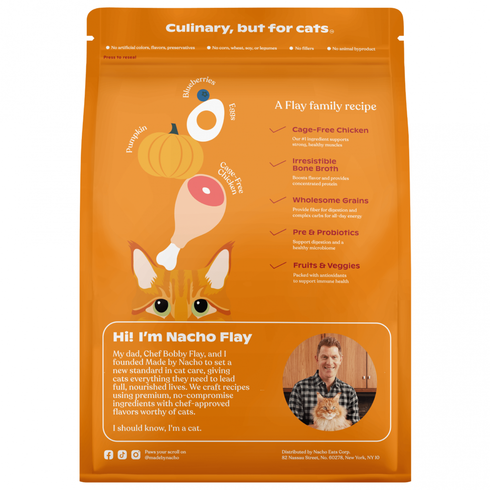 Nacho and Bobby Flay partnered with leading pet nutritionists to create this chef-inspired, cat-approved high protein kibble. Premium, cage-free chicken (#1 ingredient) is loaded with amino acids for strong muscles. Infused with slow-simmered bone broth for a delectabe flavor (and crunch!) your cat will crave. Prebiotics and probiotics keep digestion on track and support a healthy gut microbiome. Antioxidant-rich fruits and vegetables help maintain healthy immunity. Omega-3 and Omega-6 fatty acids nourish skin and make coats super shiny. Wholesome grains provide fiber for digestion and complex carbs for all-day energy.