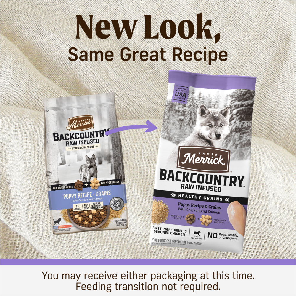 Connect your puppy to an ancestral diet with Merrick Backcountry Healthy Grains, Dry Puppy Dog Food Recipe. Real deboned chicken is the first ingredient in this natural, with added vitamins, minerals, and nutrients recipe, a high protein dog food that helps support developing muscles and energy levels. This dry puppy food with chicken and salmon contains a holistic blend of kibble and freeze-dried raw pieces inspired by an ancestral canine diet and is crafted to provide the taste of raw dog food in a delicious and convenient recipe. There are easily digestible oats, and wholesome ingredients included in this dry dog food with grains recipe to support a complete and balanced puppy dog food. This premium dog food is made without peas or lentils and contains no artificial flavors or preservatives. Merrick Backcountry dog food recipes are proudly founded in Hereford, Texas, crafted in USA facilities.<h3>Why We Love It</h3><br><ul><li>Merrick Backcountry Healthy Grains Freeze Dried Raw Pieces Plus Kibble Dry Puppy Food. Natural Kibble With Added Vitamins, Minerals and Nutrients, Chicken And Salmon</li><li>Real deboned chicken is the first ingredient in this wholesome high protein puppy dog food crafted with a blend of whole grains like oats to support healthy digestion</li><li>Puppy recipe with chicken, salmon and grains inspired by ancestral canine diets, features a holistic blend of kibble and freeze dried raw bites to deliver the nutritional benefits of an ancestral diet</li></ul>