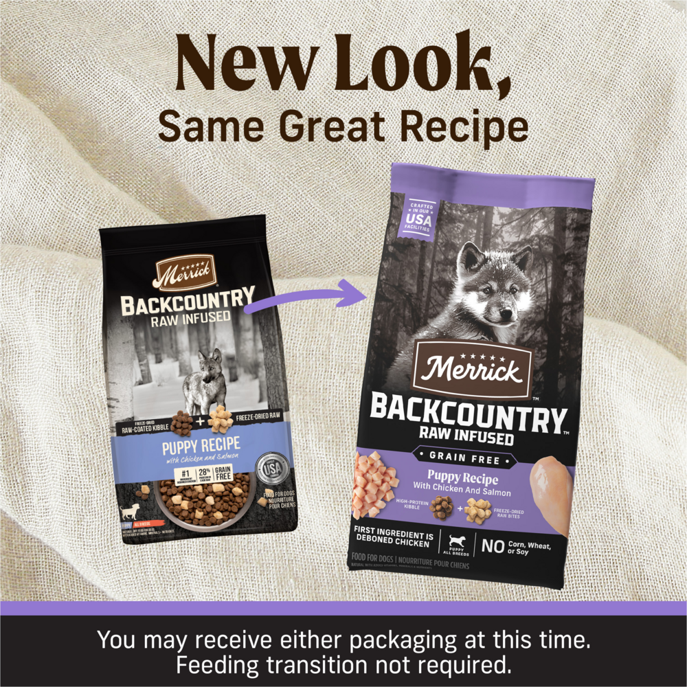 <p>Connect your puppy to an ancestral diet with Merrick Backcountry Grain Free Dog Food, Dry Puppy Recipe. Real deboned chicken is the first ingredient in this natural, with added vitamins, minerals, and nutrients recipe, a high protein dog food for puppies that helps support developing healthy muscles and energy levels. This real meat dog food with chicken and salmon contains a holistic blend of kibble and freeze-dried raw pieces inspired by an ancestral canine diet and is crafted to provide the taste of raw dog food in a convenient recipe. High levels of Omega-6 and Omega-3 fatty acids in this premium puppy dog food nourish your dog’s skin and coat, as well as high levels of glucosamine and chondroitin to support healthy development of hips and joints. Backcountry Grain Free puppy food is gluten free for a wholesome and healthy dog food option. Merrick Backcountry dog food recipes are proudly founded in Hereford, Texas, crafted in USA facilities.<br></p><h3>Why We Love It</h3><ul><li>Merrick Backcountry Grain Free Puppy Food Recipe. Gluten Free Dry Puppy Dog Food Kibble with Freeze Dried Raw Pieces.</li><li>Real deboned chicken is the first ingredient in this high protein dog food formulated for puppies to help developing healthy muscles and energy levels, with added vitamins, minerals and nutrients</li><li>Wholesome grain free dry puppy food recipe features a holistic blend of kibble and real freeze dried raw bites to deliver the nutritional benefits of an ancestral diet<br></li></ul>