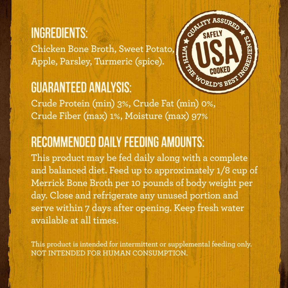 Increase moisture in your dog’s and cat’s diets with Merrick Grain Free Chicken Bone Broth, added as a dog food topper and cat food broth to your pet’s bowl. This natural dog food and natural cat food is a human grade meal topper that adds extra moisture and flavor to your dog’s and cat's diet. Now available for cats, this cat bone broth topper is accented with superfoods and unique spices including cinnamon, turmeric and ginger. This grain free chicken bone broth for dogs and cats can be used as a sensitive stomach cat food topper. Serve chicken bone broth Merrick dog treats on top of dry natural dog food, as natural dog treats or mixed with freeze dried raw bits in place of water as a savory chicken meal mixer for dogs. All Merrick recipes are crafted in our Hereford, TX kitchen and cooked in the USA, in facilities that uphold strict FDA guidelines.<h3>Why We Love It</h3><br><ul><li>Merrick Grain Free Chicken Bone Broth, Human Grade Dog Food Meal Topper and Cat Bone Broth<li>Add this high quality, human grade meal topper bone broth for dogs and cats on top of natural dog food, as soft gluten free treats, or in place of water for a nourishing cat food broth flavor boost<li>A savory, human grade dog food meal topper accented with superfoods like sweet potato and apple</ul>