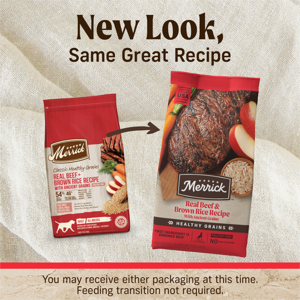 Offer your dog a recipe made from naturally nutrient-rich ingredients that support overall health with Merrick Classic Healthy Grains Real Beef and Brown Rice Recipe Dry Dog Food with Ancient Grains. Real deboned beef is the first ingredient in this dog food with brown rice, helping to build and maintain healthy muscle tissue. This natural dog food also features a healthy blend of grains, including quinoa and ancient grains, to support healthy digestion. Leading levels of glucosamine and chondroitin for dogs are added to support your dog’s healthy hips and joints, while omega-6 and omega-3 fatty acids support their healthy skin and coat. Crafted with a healthy balance of protein, produce, and a blend of whole grains, this potato free dog food has no peas or lentils. Vitamins and minerals are included to ensure this whole grain dog food provides a balanced diet. Like all Merrick recipes, this beef dog food formula is proudly founded in Hereford, TX, crafted in USA facilities.<h3>Why We Love It</h3><br><ul><li>Merrick Healthy Grains Premium Dry Dog Food With Beef And Brown Rice Recipe, Wholesome And Natural With Added Vitamins And Minerals Kibble With Ancient Grains For Adult Dogs<li>Real deboned beef is always the first ingredient in this dry dog food recipe crafted with a holistic blend of whole grains like oats for healthy digestion<li>Premium beef kibble with ancient grains features leading levels of glucosamine and chondroitin for dogs, to provide hip and joint support in adult dogs</ul>