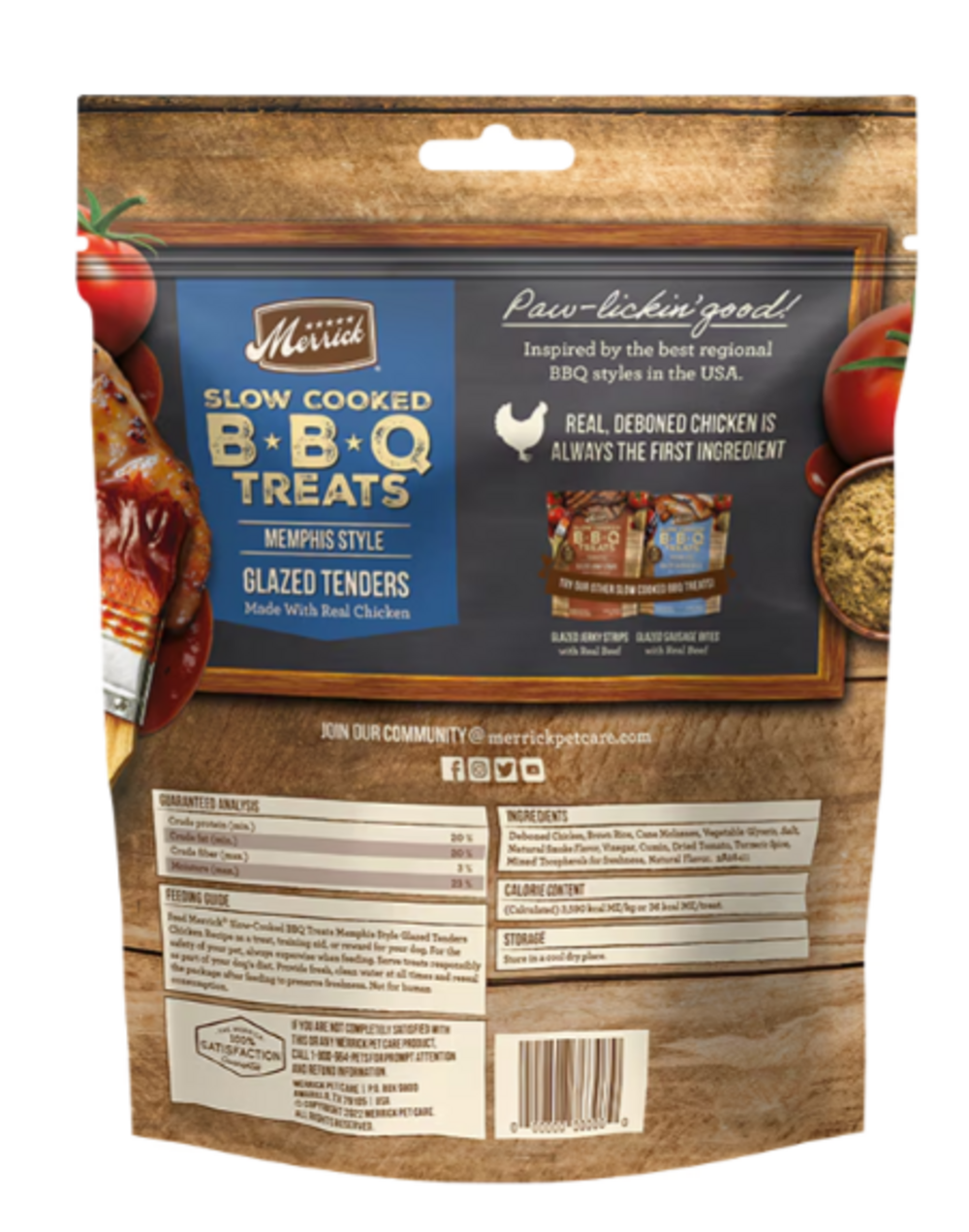 Merrick Slow Cooked BBQ Chicken Memphis Style Glazed Tenders Jerky Dog Treats are packed with yummy BBQ flavor your furbaby can really sink his teeth into! These all-natural treats are inspired by the best regional BBQ styles in the USA. They start with real deboned chicken as the first ingredient, and they’re free of gluten and artificial colors, flavors, preservatives and fillers. You can tear the strips into smaller pieces for training rewards, or feed them whole as a su-paw special snack. They’re paw-fect for dogs of all sizes.Rawhide-free treats are crafted in the USA. Real deboned chicken is the first ingredient—real chicken in every bite.Su-paw delicious smell and taste, inspired by the best regional BBQ styles in the USA.