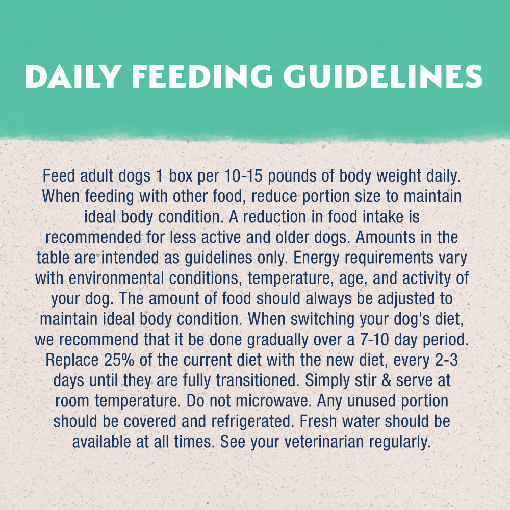 Single animal proteins from chicken, ?beef, or duck. Hearty stews cooked in broth?. Serve as a complete meal or kibble topper??. Convenient, easy-open carton makes everyday feeding easy. Complete & balanced for adult dogs.??