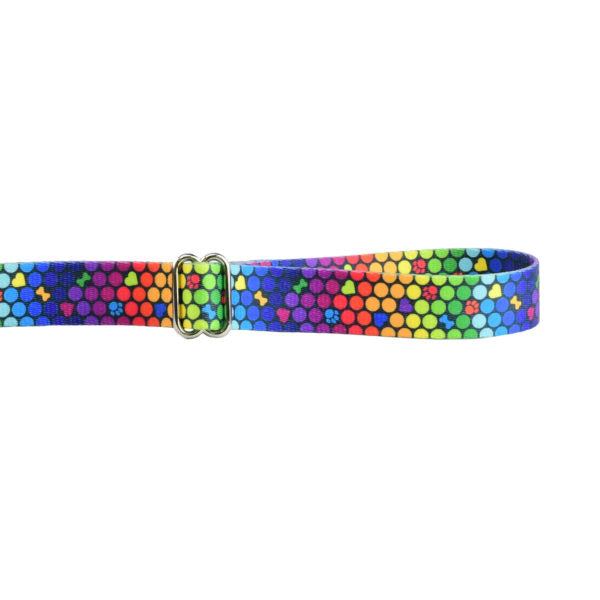 Roy G Biv is the name, color is the game! Step out in style with this colorful and fun rainbow dog leash featuring polka dots, paws, bones, and hearts in all the colors of the rainbow!