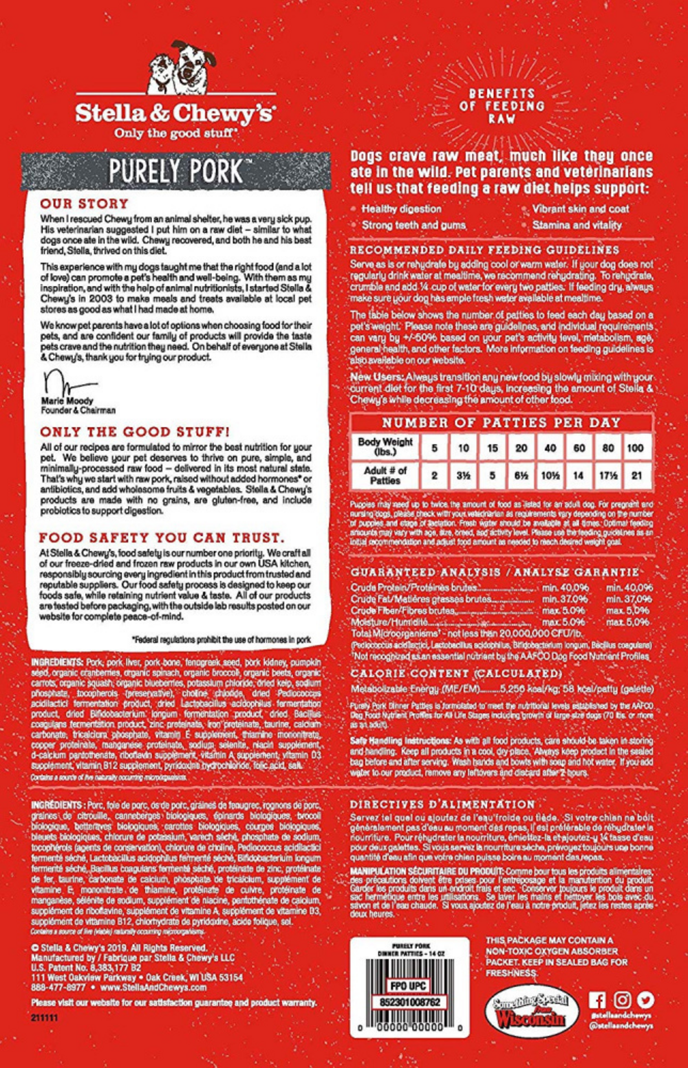 <p>Give your dog what he/she naturally craves with Stella & Chewy's Purely Pork Dinner Patties Freeze-Dried Raw Dog Food. Based on the philosophy that dogs thrive on the same diet they would eat in the wild, this all-natural recipe makes it easy to feed your best friend only the good stuff. Made from sustainably-sourced ingredients and raw, single-source protein, this recipe starts with 95% pork, organs and bone, plus 100% certified-organic fruits and vegetables—offering the benefits of raw food nutrition with the convenience of freeze-dried preparation. And to ensure the highest quality, each batch is made with care in Stella & Chewy’s own USA kitchen.<br><h3>Why We Love It</h3><ul><li>A single protein single recipe (poultry-free) made with pork and 100% organic-certified fruits & veggies<li>Grain-free, all-natural and minimally-process dog food contains zero added hormones, antibiotics, grains or fillers.<li>Raw nutrition and convenience - your pet deserves to thrive on real, raw meat. Now Stella & Chewy's makes it easier than ever to give your pet real raw nutrition with the convenience of freeze-dried.<li>A raw diet may help to support healthy digestion, strong teeth & gums, vibrant skin & coat as well as stamina and vitality<li>Every small batch is proudly made with responsibly sourced ingredients in Stella & Chewy's USA kitchen.</ul><p><br><h3>About The Stella & Chewy's</h3><p>At Stella & Chewy’s, we believe that selecting the best food is one of the most important decisions a pet parent makes. From our first delivery to the last batch crafted in our own USA kitchen, we are focused on making the highest quality pet food available. We only use quality ingredients responsibly sourced from farmers and ranchers we know and trust. Our dinners are 90-95% meat, organs & bone and our animal proteins have no added hormones or antibiotics.