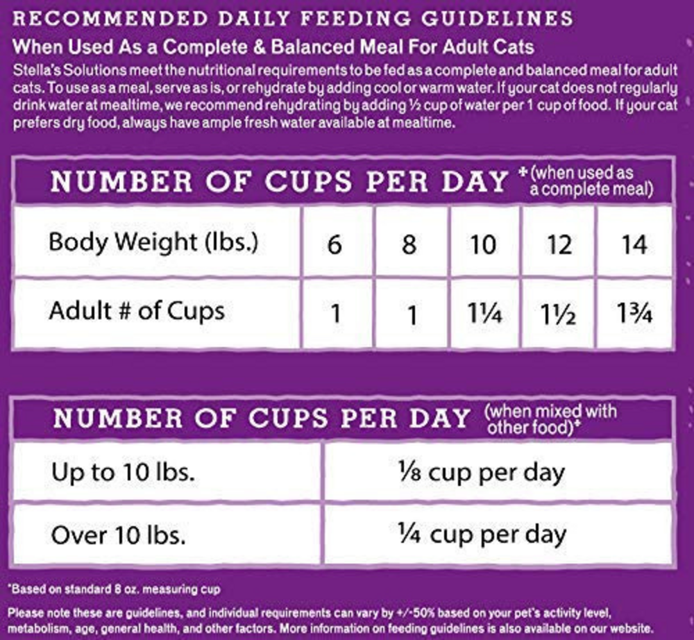 Boost your cat's diet with Stella's Solutions! Each of our 2 unique recipes offer complete & balanced nutrition that provide an extra boost to help proactively support pet health. Stella's Solutions recipes target digestive and skin & coat issues to keep your pet healthy and thriving!• SUPPLEMENT HEALTHY DIGESTION for your cat with Stella’s Solutions complete & balanced freeze-dried raw Dinner Mixers. This always-tasty cat food topper promotes healthy digestion and intestinal health. Simply add to your cat’s favorite kibble or dry food and make mealtime extra special.• ALL-NATURAL, ACTIVE INGREDIENTS like pineapple and pineapple stems (to deliver a natural source of fiber) for overall intestinal health, L-carnitine to improve metabolism, papaya and probiotics that aid in digestion and intestinal health. Each recipe is grain-free, pea-free, lentil-free and potato-free. AND includes added taurine.• MADE IN THE USA in Stella & Chewy’s own kitchen with cage-free chicken. Each ingredient is responsibly sourced and never from China.• ALL-IN-ONE SUPPLEMENT AND FEEDING SOLUTION that helps with indigestion relief for cats, overall intestinal health/digestive boost and adds the benefit of raw nutrition to a cat’s diet in one convenient cat food. BONUS: Even the pickiest eaters go wild for this topper!<b>Feeding Instructions</b>When used as a complete & balanced meal for adult cats: Stella's Solutions meet the nutritional requirements to be fed as a complete and balanced meal for adult cats. To use as a meal, serve as is, or rehydrate by adding cool or warm water. If your cat does not regularly drink water at mealtime, we recommend rehydrating by adding 1/2 cup of water per 1 cup of food. If your cat prefers dry food, always have ample fresh water available at mealtime. Number of cups per day* (When used as a complete meal): Body Weight (lbs.) Adult # of Cups 6 1 8 1 10 1 1/4 12 1 1/2 14 1 3/4 Number of cups per day* (When mixed with other food) Up to 10 lbs. 1/8 cup per day Over 10 lbs. 1/4 cup per day *Based on standard 8 oz. measuring cup Please note that these are guidelines, and individual requirements can vary by +/- 50% based on your pet's activity level, metabolism, age, general health, and other factors. More information on feeding guidelines is also available on our website.