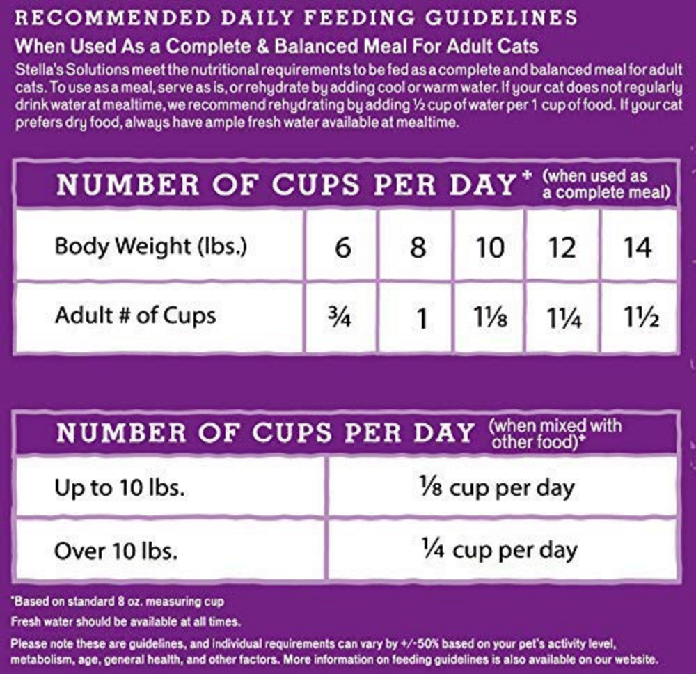 Boost your cat's diet with Stella's Solutions! Each of our 2 unique recipes offer complete & balanced nutrition that provide an extra boost to help proactively support pet health. Stella's Solutions recipes target digestive and skin & coat issues to keep your pet healthy and thriving!• SUPPLEMENT HEALTHY SKIN AND COAT for your cat with Stella's Solutions complete & balanced freeze-dried raw Dinner Mixers. This always-tasty cat food topper promotes skin health and a soft & shiny coat. Simply add to your cat’s favorite kibble or dry food and make mealtime extra special.• ALL-NATURAL, ACTIVE INGREDIENTS like salmon and salmon oil (to deliver high levels of omega 6 fatty acids and linoleic acid) for overall skin health, biotin for a safe natural boost for a shiny & healthy coat and chia seed that is rich in omega 3 fatty acid. Each recipe is grain-free, pea-free, lentil-free and potato-free. AND includes added taurine.• MADE IN THE USA in Stella & Chewy’s own kitchen with cage-free duck and wild-caught salmon. Each ingredient is responsibly sourced and never from China.• ALL-IN-ONE SUPPLEMENT AND FEEDING SOLUTION that helps with itchy skin relief for cats, overall skin & coat boost and adds the benefit of raw nutrition to a cat’s diet in one convenient cat food. BONUS: Even the pickiest eaters go wild for this topper!When used as a complete & balanced meal for adult cats: Stella's Solutions meet the nutritional requirements to be fed as a complete and balanced meal for adult cats. To use as a meal, serve as is, or rehydrate by adding cool or warm water. If your cat does not regularly drink water at mealtime, we recommend rehydrating by adding 1/2 cup of water per 1 cup of food. If your cat prefers dry food, always have ample fresh water available at mealtime. Number of cups per day* (When used as a complete meal): Body Weight (lbs.) Adult # of Cups 6 3/4 8 1 10 1 1/8 12 1 1/4 14 1 1/2 Number of cups per day* (When mixed with other food) Up to 10 lbs. 1/8 cup per day Over 10 lbs. 1/4 cup per day *Based on standard 8 oz. measuring cup Please note that these are guidelines, and individual requirements can vary by +/- 50% based on your pet's activity level, metabolism, age, general health, and other factors. More information on feeding guidelines is also available on our website.