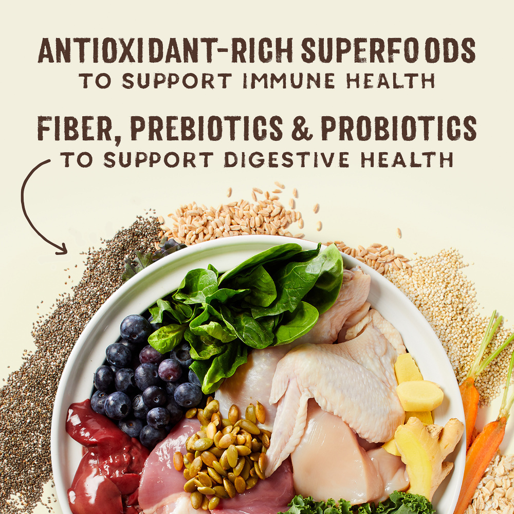 Crafted with your pets health in mind SuperBlends come in four irresistible recipes in your choice of Raw Coated or Raw Blend formulas that are sure to satisfy even the pickiest eaters.CageFree Chicken & Duck Recipe.WildCaught Whitefish & Salmon Recipe.GrassFed Beef Beef Liver & Lamb Recipe.Puppy CageFree Chicken & WildCaught Salmon Recipe.Each recipe is rawcoated and superfoodpowered giving your dog the maximum flavor and nutrition in every bite. Our smallbatch ovenbaking process helps preserve all the nutrients your dog needs to stay healthy and strong. All of our SuperBlends recipes are complete and balanced meals giving your dog everything they need in one bag. Our Raw Blend recipes even have pieces of freezedried raw meat mixed right in for an extra protein boost. SuperBlends are made with a unique blend of responsibly sourced proteins to support strong, healthy muscles. Meats, poultry, and fish in our SuperBlends recipes are raised without added hormones or antibiotics. Additionally, all of our SuperBlends recipes contain a variety of superfoods, including oatmeal, flaxseed, quinoa, organic blueberries, organic broccoli, organic beets, organic carrots, organic spinach, organic squash, organic cranberries, chia seed, pumpkin seeds, salmon oil, chicory root, kale, pumpkin, ginger, turmeric, dried kelp, and New Zealand green mussel. Superfood-Powered Kibble: Raw-coated, nutrient-packed, and crafted with a unique blend of responsibly sourced proteins, grains, and superfoods, SuperBlends help your dog thrive. Delicious Taste, Guaranteed: Made with bone broth and raw-coated for maximum flavor, SuperBlends offer an irresistible taste that your pup is sure to love. Plus, all of our recipes are complete and balanced meals, giving your dog everything they need in one bag. Small-Batch, Nutrient-Rich: Our SuperBlends recipes are oven-baked in small batches, helping preserve all the nutrients your pup needs to stay healthy and strong. Quality Ingredients: SuperBlends feature meats, poultry, and fish raised without added hormones or antibiotics, along with wholesome grains like oatmeal and quinoa and a plethora of superfoods to provide your dog with a range of vitamins and nutrients for optimal health.