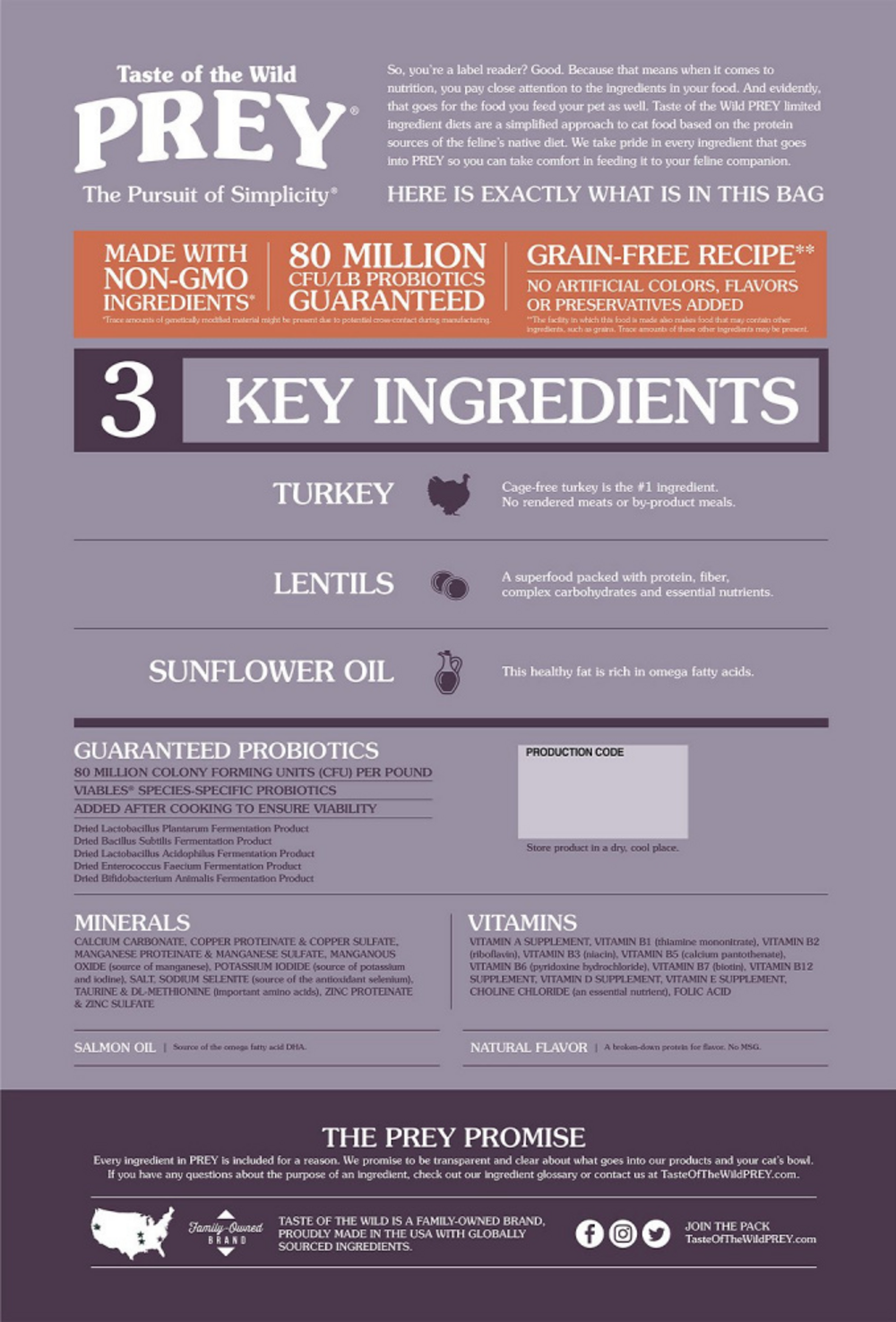 The fowl your cat’s ancestors hunted didn’t live in a cage, so neither do ours. Cage-free turkey is the main ingredient in this simple but satisfying limited ingredient diet. 98% of protein comes from just two ingredients: 60% from turkey and 38% from lentils. Chicken fat and carefully selected vitamins and minerals round out this complete diet, while guaranteed probiotics help support digestion. With PREY limited ingredient diets, you can give your cat the complete nutrition they need and a taste they crave — without the hunt.