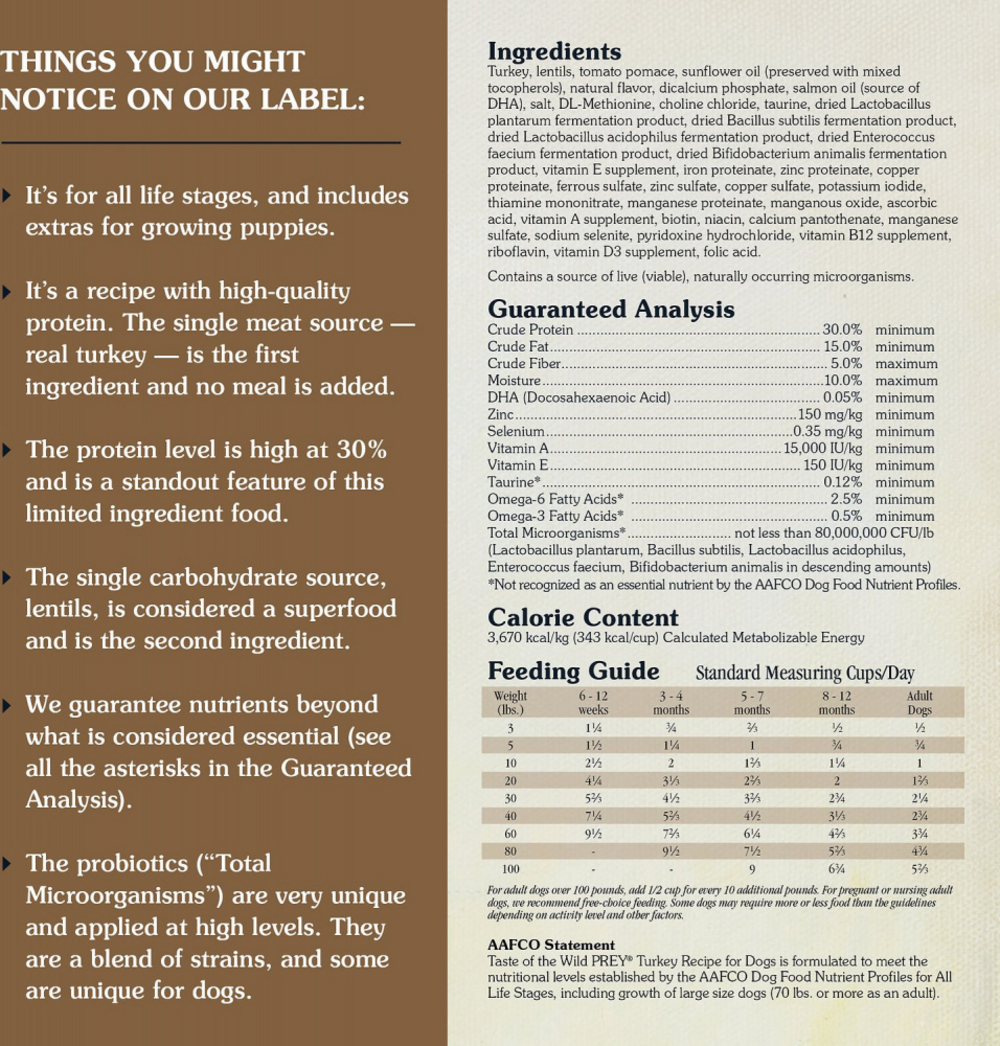 The diet of the native canine was quite simple, consisting mainly of the prey they hunted. A simple, limited ingredient diet offers many benefits. They can be easier for some dogs to digest and may be a good choice for dogs who have experienced sensitivities to certain ingredients. PREY Turkey Recipe for Dogs features cage-free turkey as the first of just four key ingredients, followed by lentils, chicken fat and tomato pomace which provide antioxidants, omega fatty acids and important nutrients such as DHA. Finally, guaranteed, species-specific probiotics help support digestion and carefully selected vitamins and minerals ensure your dog gets the simple yet complete nutrition they need, without the hunt.