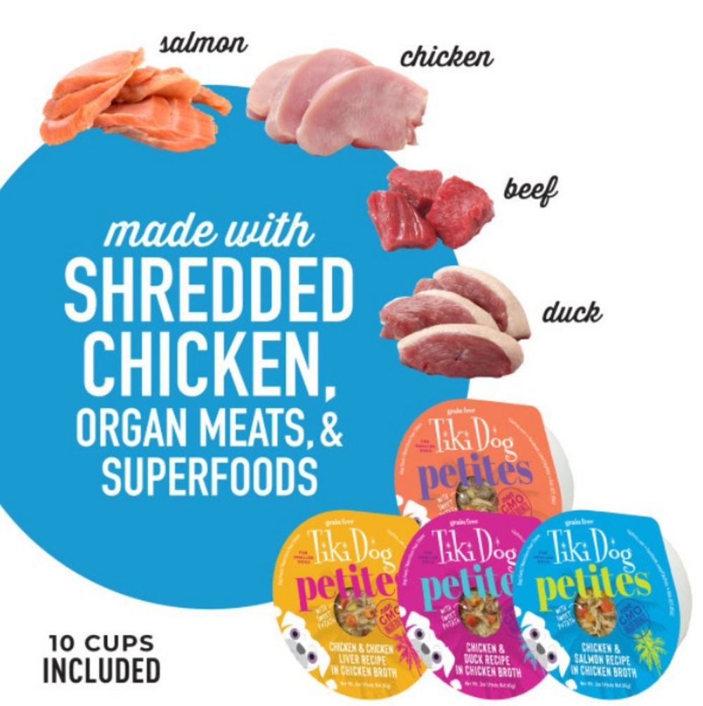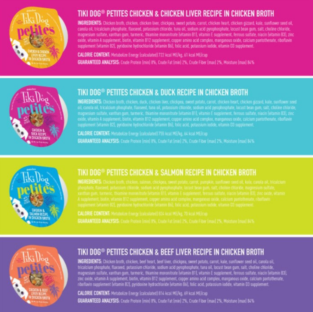 Tiki Dog Aloha Petites Wet Dog Food is hearty meals with tender shredded chicken flaked fish and nutritious vegetables in a savory broth. Pure bliss with every bite.REAL INGREDIENTS, REAL MEAT – High-quality chicken, Sardine and nutrient-dense organ meat.