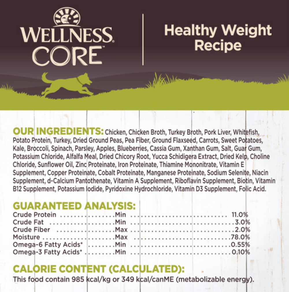 <p>Wellness CORE Grain Free Natural Weight Management Chicken, Pork Liver, Whitefish and Turkey Recipe Wet Canned Dog Food is completely free of grains and is made with high quality chicken, pork liver, whitefish and turkey with added fruits and vegetables for extra fiber to help achieve and maintain a healthy weight for your dog! This recipe is rich in fiber and will keep your dog full for a longer period of time. Another added benefit of this recipe is that omega fatty acids like fish and flaxseed is blended for healthy skin and coat.<br><h3>Why We Love It:</h3><ul><li>Grain-free, simple-to-digest recipe with added probiotics for dogs with sensitive stomachs.<li>No by-products, fillers, soy, corn, artificial preservatives, colors or flavors.<li>Made in the USA</ul><p><br><h3>About Wellness</h3><p>What our pets eat feeds the soul and protects the body. That's why Wellness takes carefully selected, authentic ingredients from trusted sources to create an ideal nutritional balance with lean, healthy proteins, probiotics, omega fatty acids, fresh fruits and veggie antioxidants, and vitamins and nutrients. With over 200 varieties of foods with high quality proteins like salmon, beef, rabbit, and duck, in grain-free limited ingredient, dry and wet formulas, Wellness can offer every dog and cat something special and perfect just for them. Using only whole foods, with no wheat, corn, soy, preservatives, artificial colors and flavors, or empty calories, Wellness is the face of a new generation in pet food.