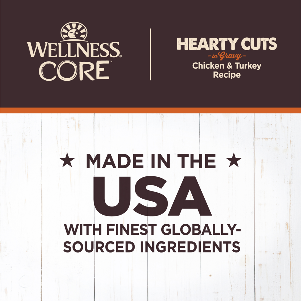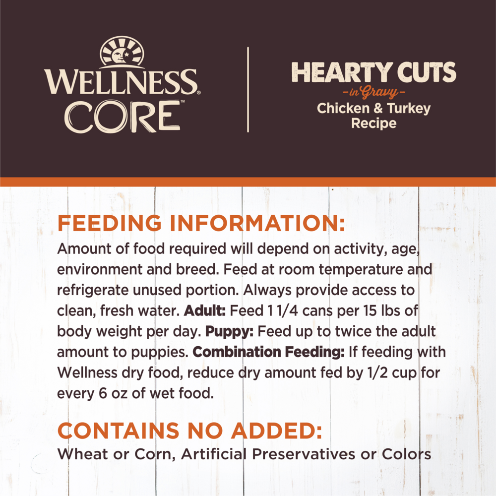 <p>Wellness CORE Natural Grain Free Hearty Cuts Chicken and Turkey Canned Dog Foodis a delicious and balanced meal made with Hearty cuts of Chicken and Turkey. This recipe is in a super tasty gravy that your dog is sure to love. As a standard for Wellness this poultry-packed recipe has no wheat, corn, soy, artificial colors, or preservatives.<br><h3>Why We Love It:</h3><ul><li>Grain-free, simple-to-digest recipe with added probiotics for dogs with sensitive stomachs.<li>No by-products, fillers, soy, corn, artificial preservatives, colors or flavors.<li>Made in the USA</ul><p><br><h3>About Wellness</h3><p>What our pets eat feeds the soul and protects the body. That's why Wellness takes carefully selected, authentic ingredients from trusted sources to create an ideal nutritional balance with lean, healthy proteins, probiotics, omega fatty acids, fresh fruits and veggie antioxidants, and vitamins and nutrients. With over 200 varieties of foods with high quality proteins like salmon, beef, rabbit, and duck, in grain-free limited ingredient, dry and wet formulas, Wellness can offer every dog and cat something special and perfect just for them. Using only whole foods, with no wheat, corn, soy, preservatives, artificial colors and flavors, or empty calories, Wellness is the face of a new generation in pet food.