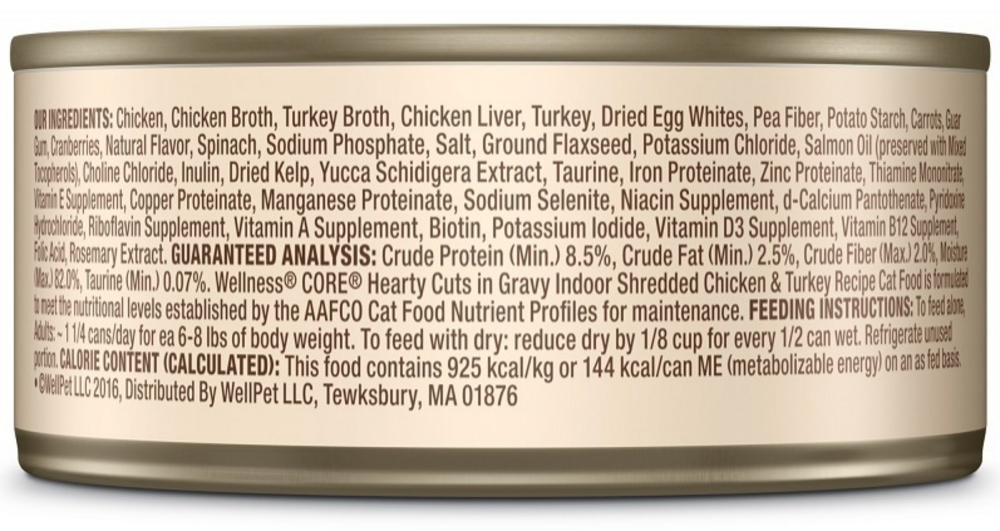<p>Wellness CORE Grain Free Hearty Cuts Indoor Chicken and Turkey Canned Cat Food is a great way to get on your cat’s good side! This recipe makes your cat’s meals meatier with all the delicious cuts of chicken and turkey covered in both a chicken and turkey mixed broth making this food packed with flavor. Not only is this recipe grain-free and will help aid in digestion, but this recipe has Superfoods like carrots and spinach to help keep your cat overall healthy and active!<br><h3>Why We Love It:</h3><ul><li>Grain-fee hearty chunks of chicken and turkey specifically for indoor cats<li>No by-products, fillers, soy, corn, artificial preservatives, colors or flavors.<li>Made in the USA</ul><p><br><h3>About Wellness</h3><p>What our pets eat feeds the soul and protects the body. That's why Wellness takes carefully selected, authentic ingredients from trusted sources to create an ideal nutritional balance with lean, healthy proteins, probiotics, omega fatty acids, fresh fruits and veggie antioxidants, and vitamins and nutrients. With over 200 varieties of foods with high quality proteins like salmon, beef, rabbit, and duck, in grain-free limited ingredient, dry and wet formulas, Wellness can offer every dog and cat something special and perfect just for them. Using only whole foods, with no wheat, corn, soy, preservatives, artificial colors and flavors, or empty calories, Wellness is the face of a new generation in pet food.