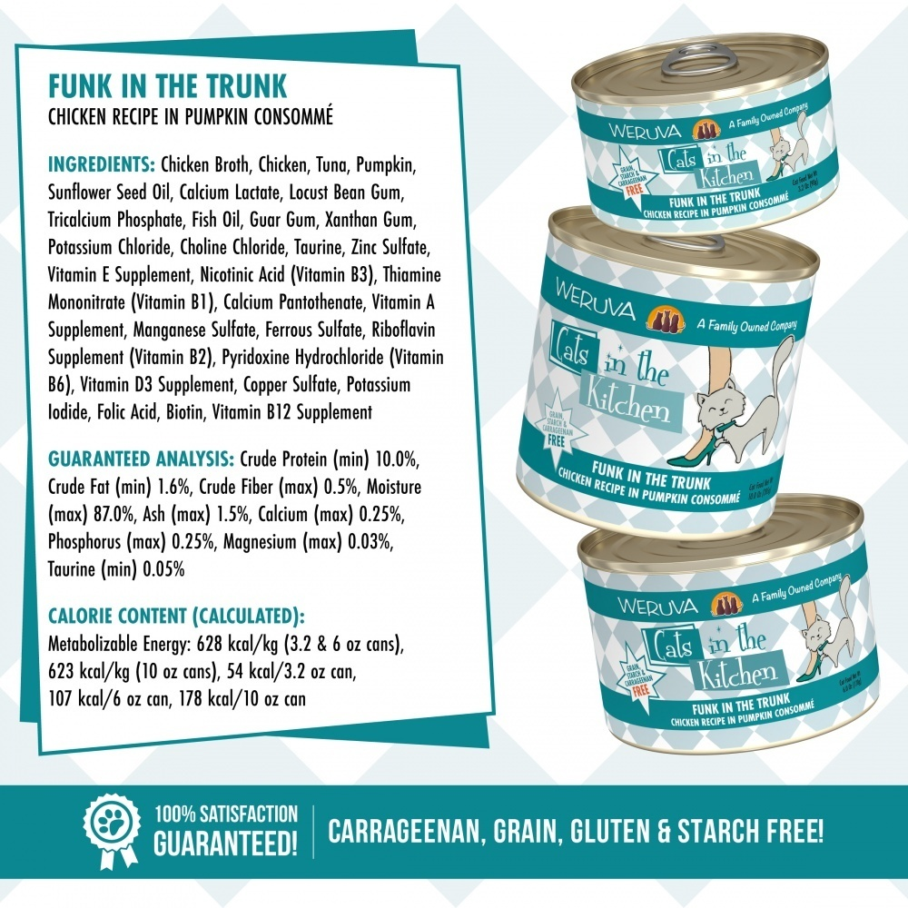 <p>The funk, the whole funk, and nothing but the funk. Get funky with your kitty with Weruva Cats in the Kitchen Funk in the Trunk Canned Cat Food. This wholesome food is a tasty chicken broth containing boneless, skinless, and cage-free chicken breast and tuna for a hungry carnivore. This food also contains pumpkin which is a proven ingredient for any cats with tummy issues. Weruva Cats in the Kitchen Funk in the Trunk Canned Cat Food is also free of any grains, GMOs, MSG, and carrageenan for a balanced meal in each can.<br><h3>Why We Love It</h3><ul><li>Grain, GMO, MSG and Carrageenan free<li>Full of sustainable protein<li>Processed with human food standards including British Retail Consortium</ul><p><br><h3>About Weruva</h3><p>We proudly present WeRuVa, a luxurious, natural pet food inspired by and named after our three rescued cats, Webster, Rudi and Vanessa. With our search for “The Best Cat Food Under the Sun” never seeming to end, we thought, “Let's give it a shot ourselves…” so we gathered the best ingredients from around the world, formulated some fantastic recipes and created it ourselves.Naturally, when we were lucky enough to have our rescued dog Baron enter our family, we decided to expand our products to include dog food.Our formulas are produced in a human food facility using many of the ingredients and processes that are used in products made for people. Our base proteins of chicken, beef and fish include only top quality muscle meat, such as white breast chicken, whole tuna loins and select cuts of beef. Then we add fresh vegetables and other unique items such as Grilled skipjack, tilapia and red bigeye tuna, as well as calamari and shirasu. Our ingredients maintain a natural look and recognizable texture which allows the pet owner to see and understand the ingredients…so what you see is what you get!We hope your furry friends love Weruva as much as Webster, Rudi, Vanessa and Baron do!